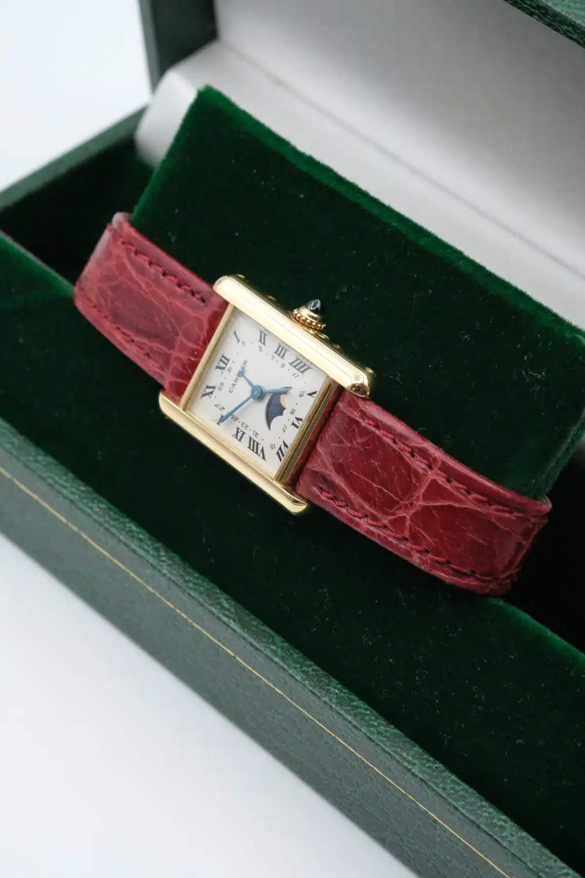 Cartier Tank Moonphase referenza 8190, oro giallo e cinturino bordeaux. Eleganza senza tempo, buone condizioni. Scatola e garanzia 24 mesi del negozio.