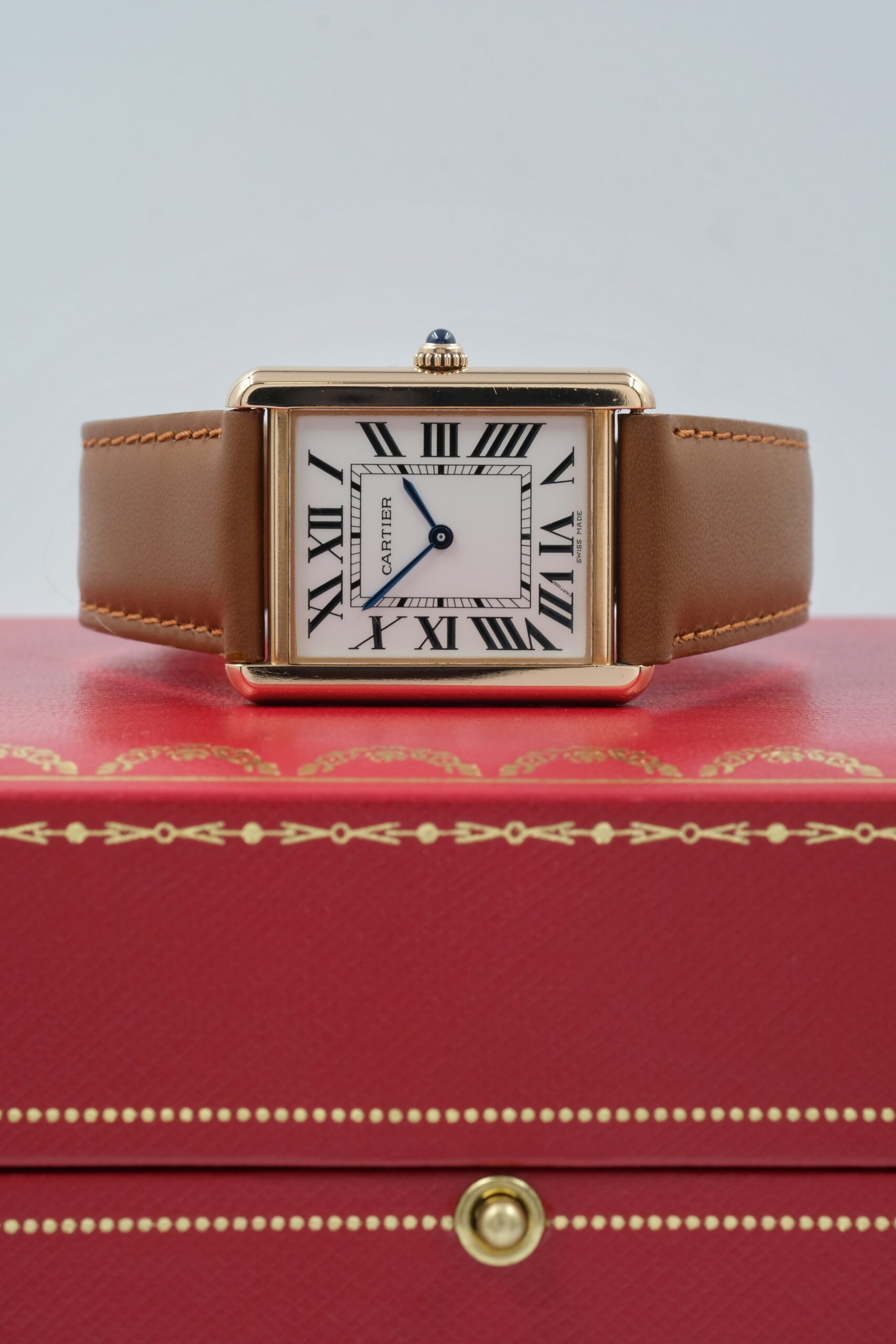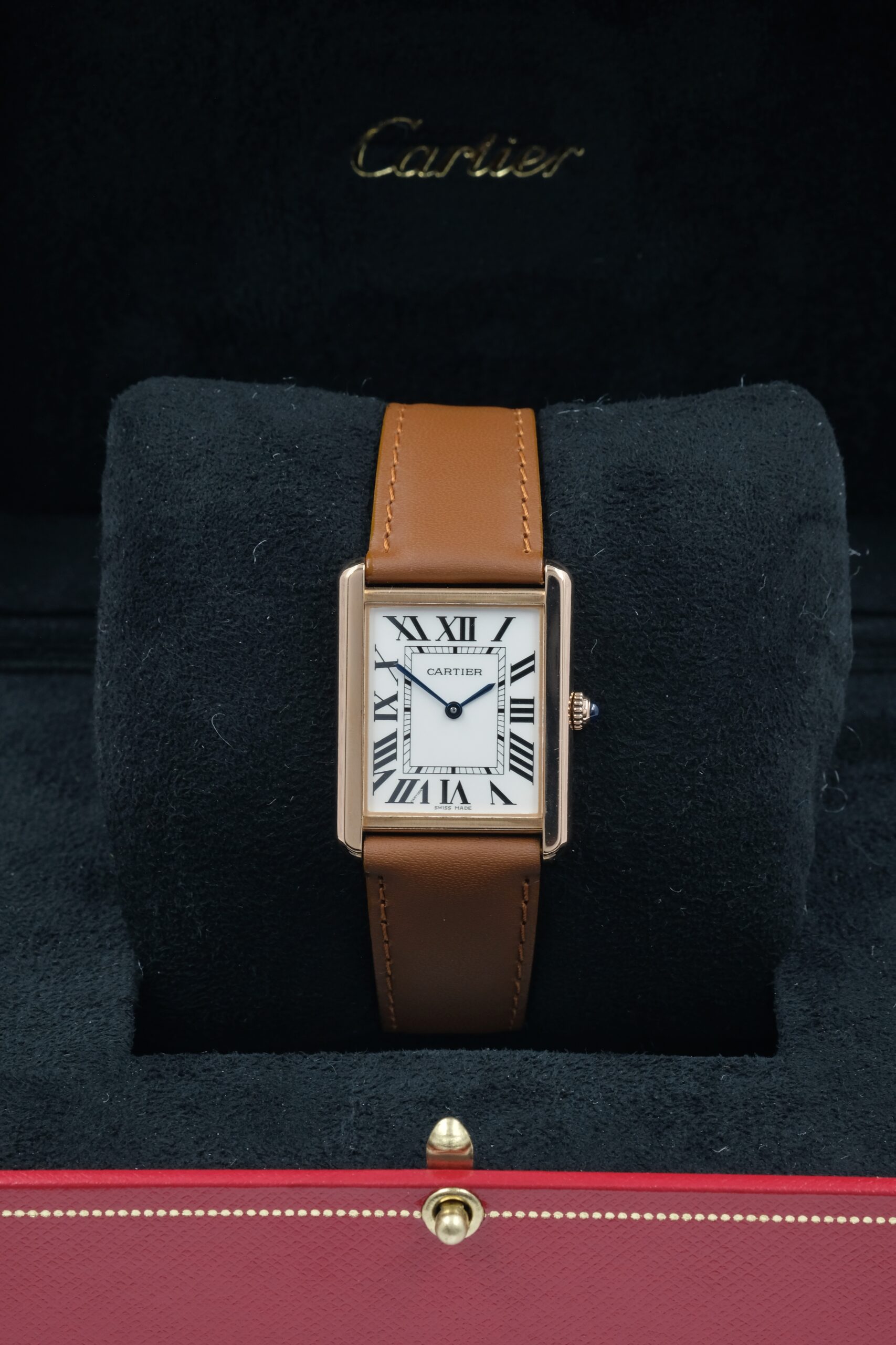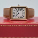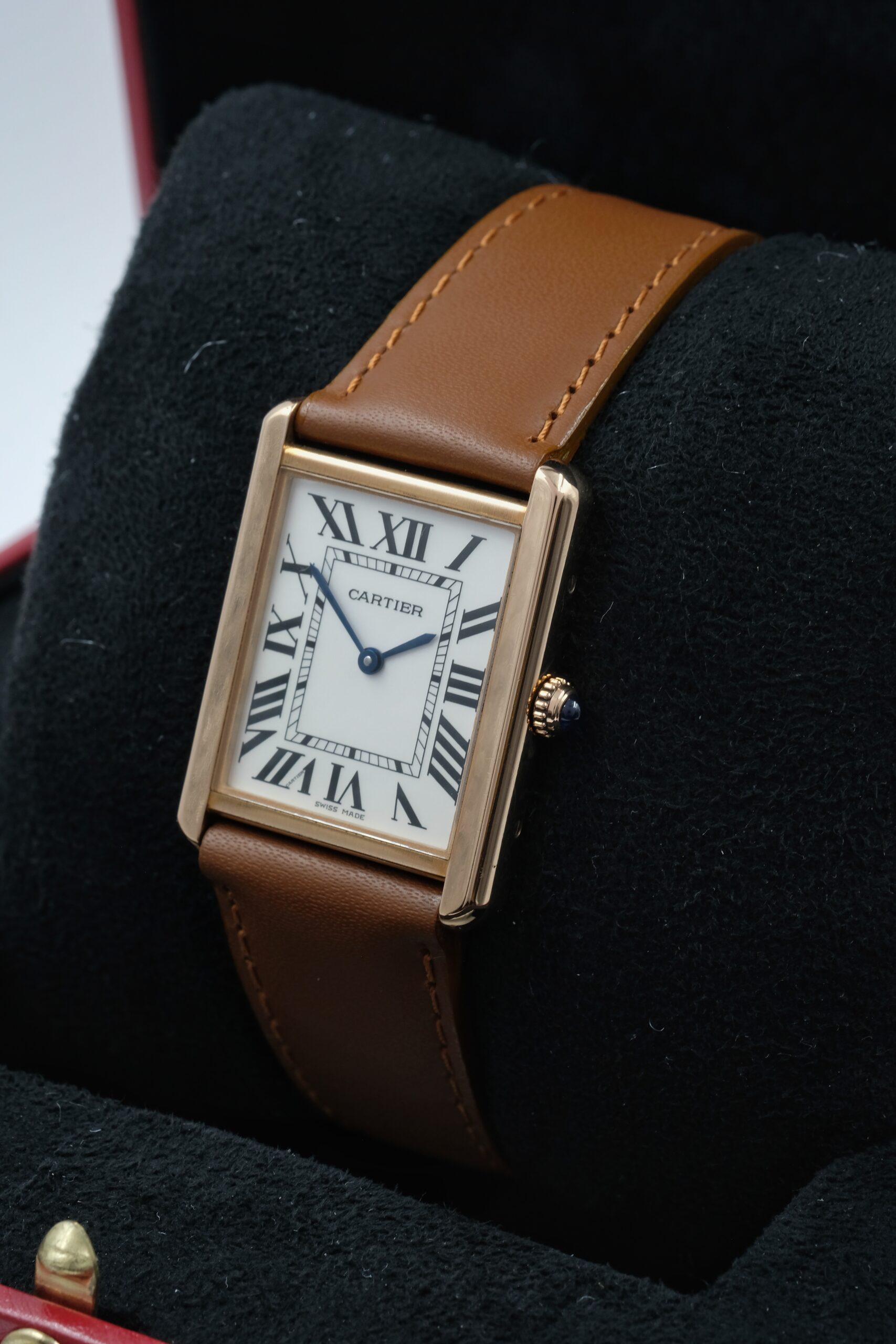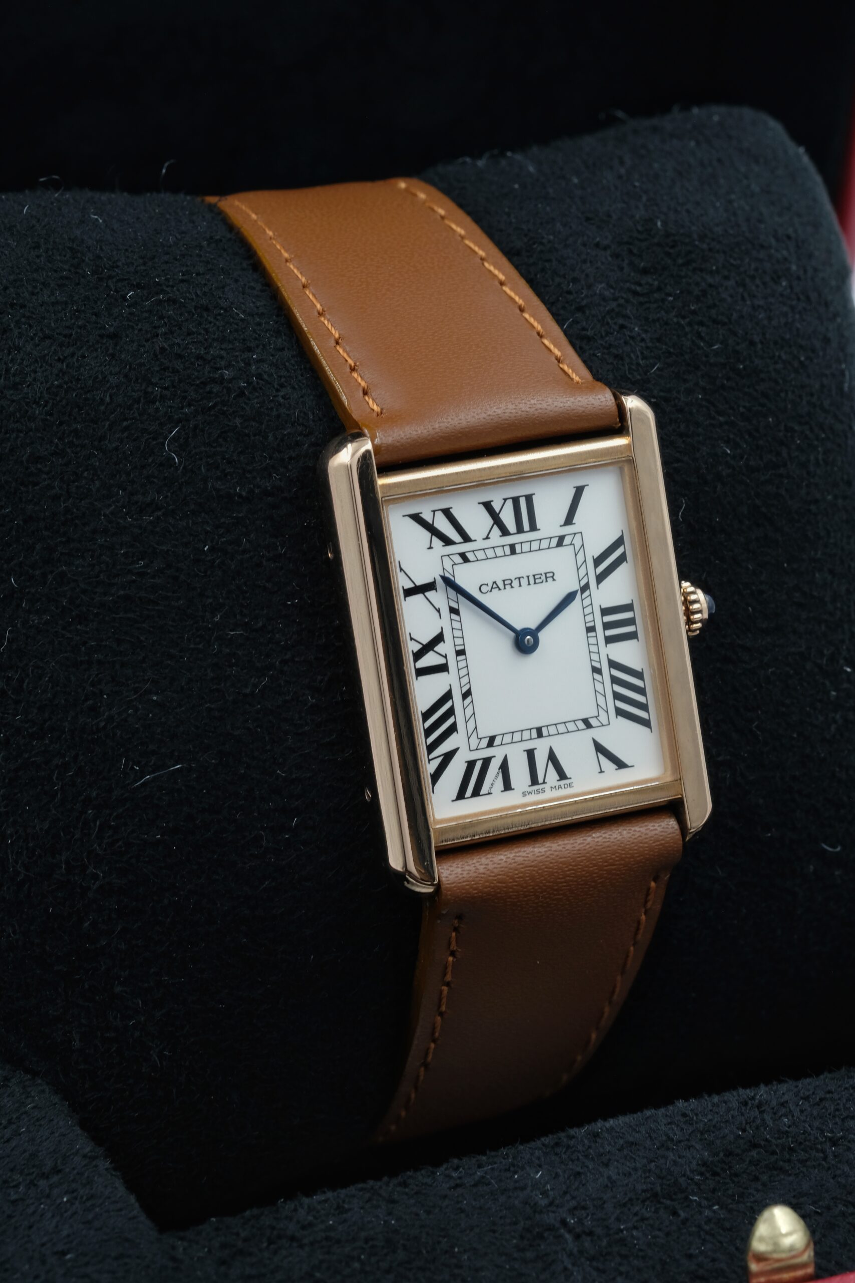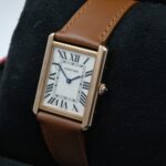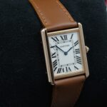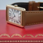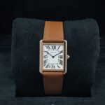 Cartier Tank Solo 3167 in acciaio e oro rosa, cassa 27×35 mm, quadrante bianco e vetro zaffiro. Cinturino in pelle marrone con ardiglione originale Cartier.