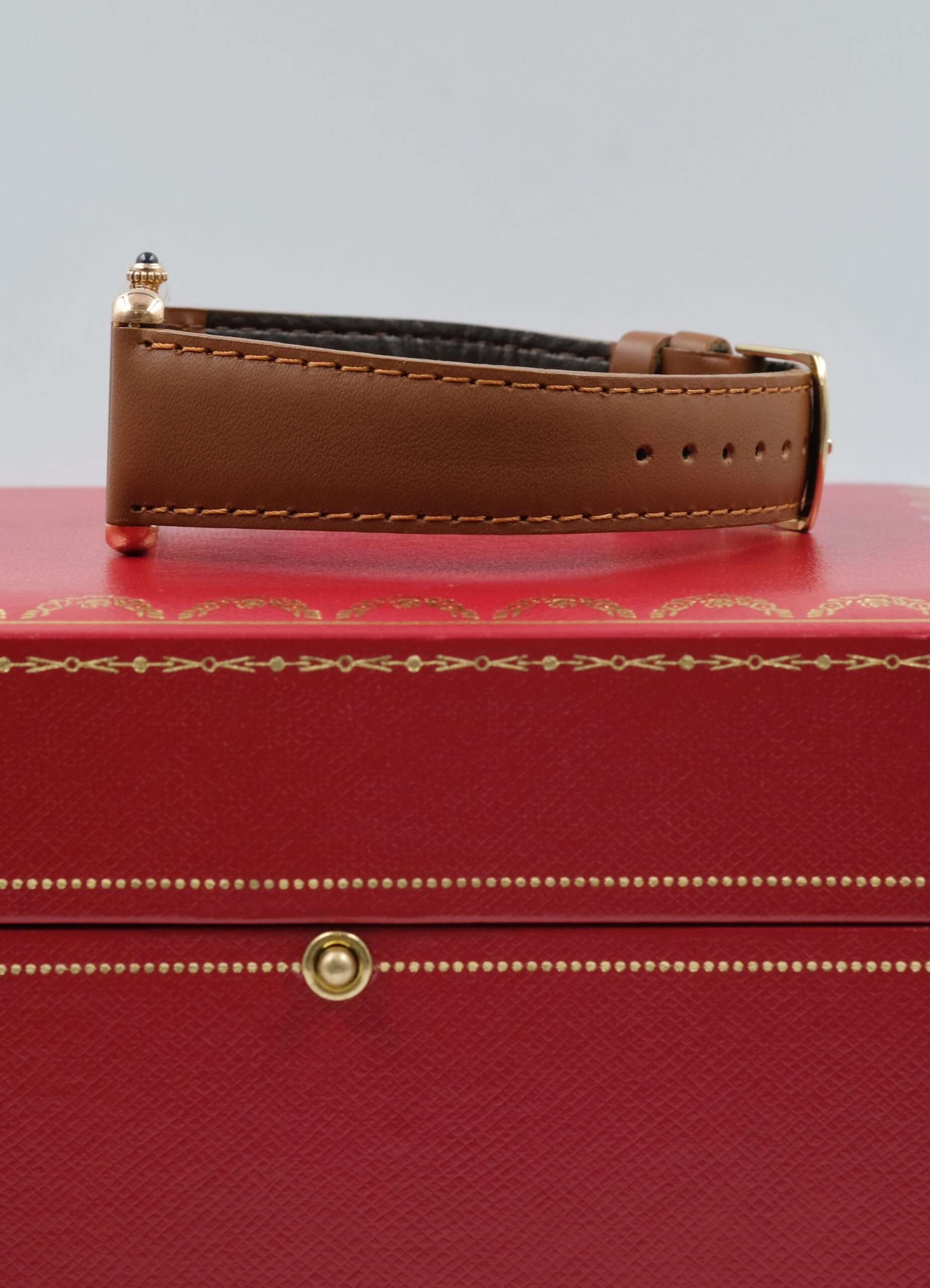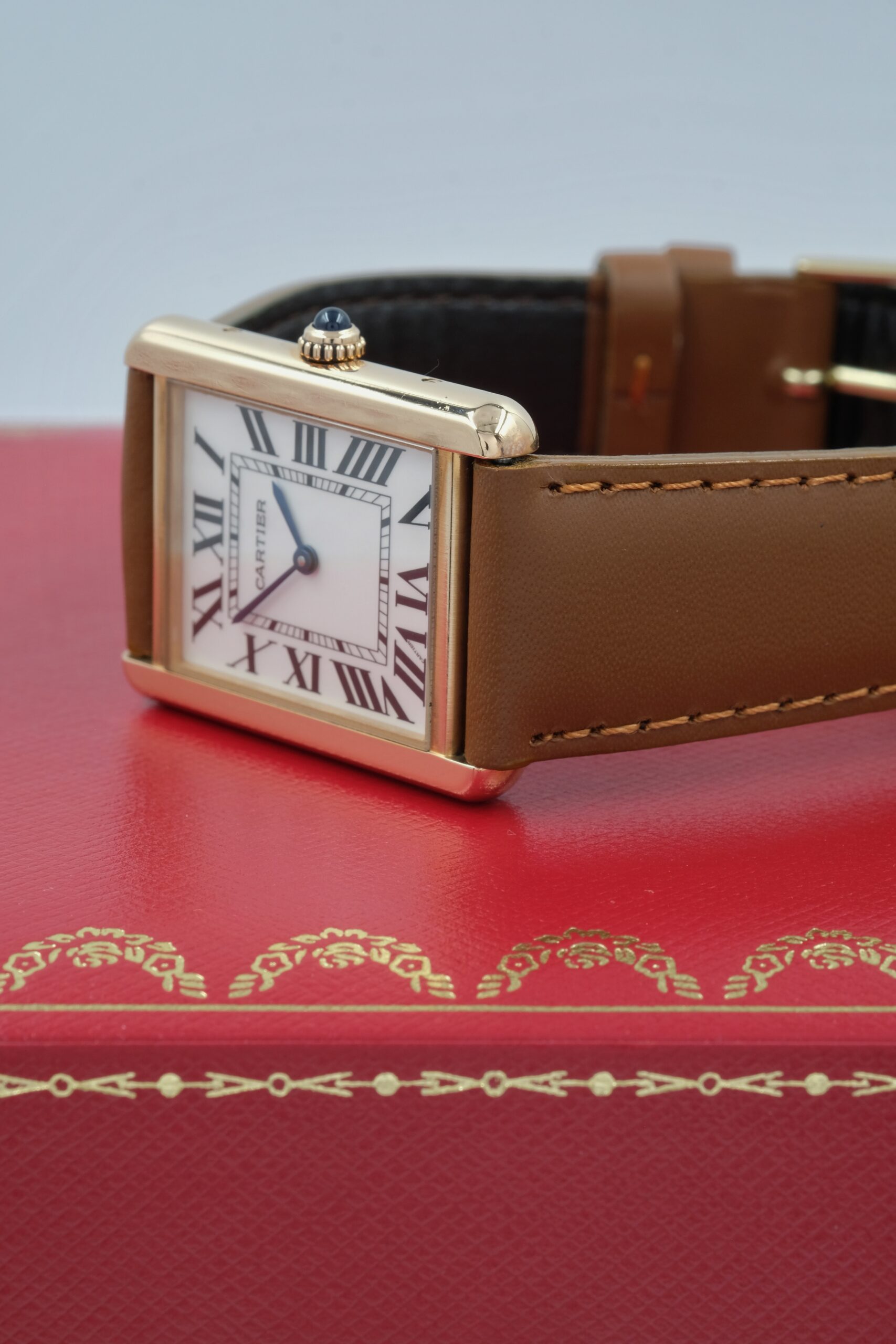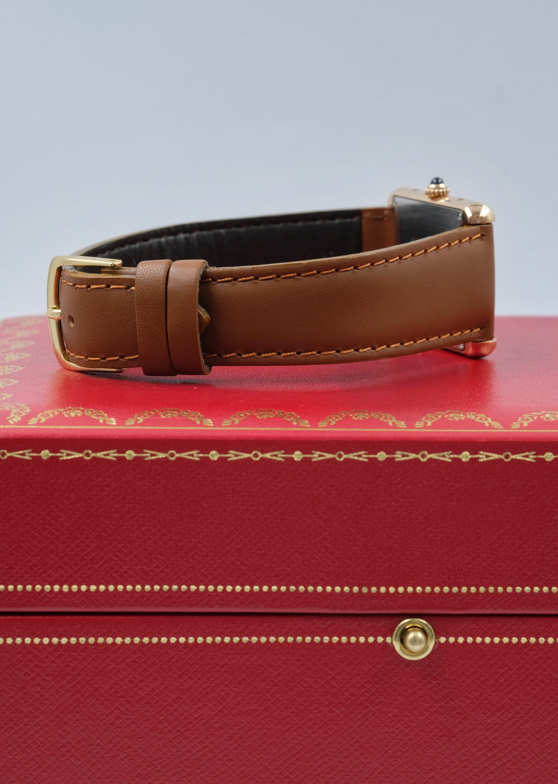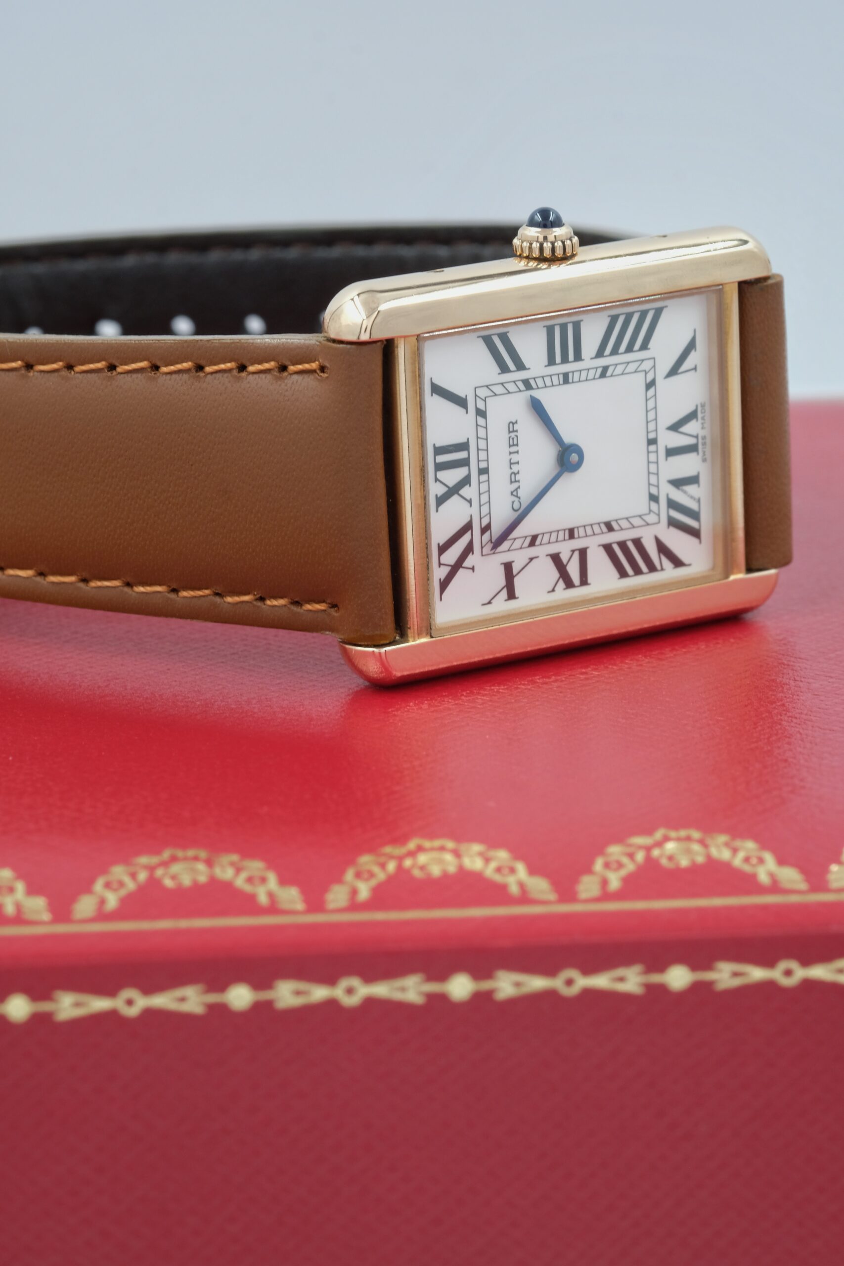 Cartier Tank Solo 3167 in acciaio e oro rosa, cassa 27×35 mm, quadrante bianco e vetro zaffiro. Cinturino in pelle marrone con ardiglione originale Cartier.