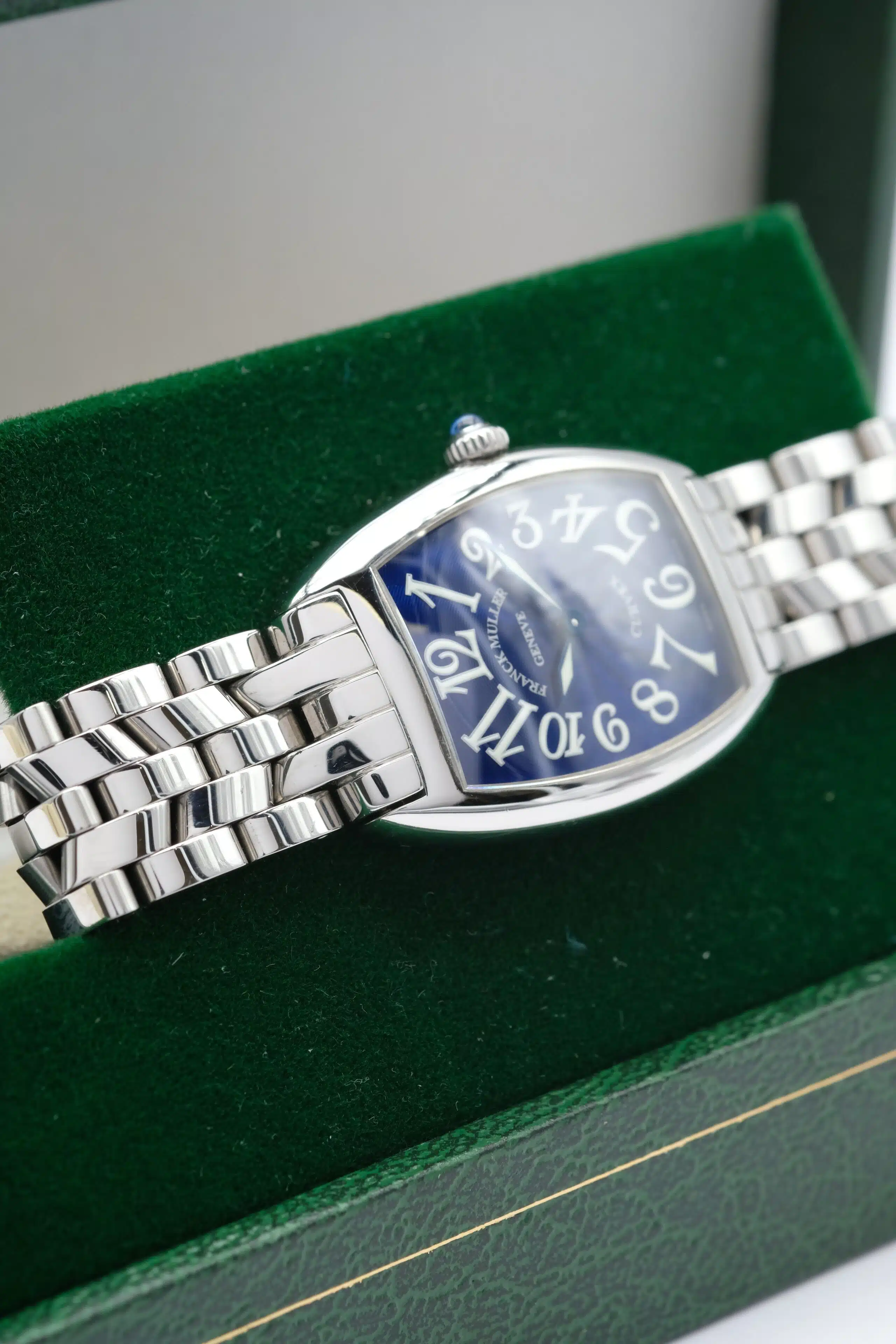 Franck Muller 1752 QZ Curvex, 25 mm in acciaio, quadrante blu e bracciale acciaio. Solo orologio, con scatola e garanzia del negozio.