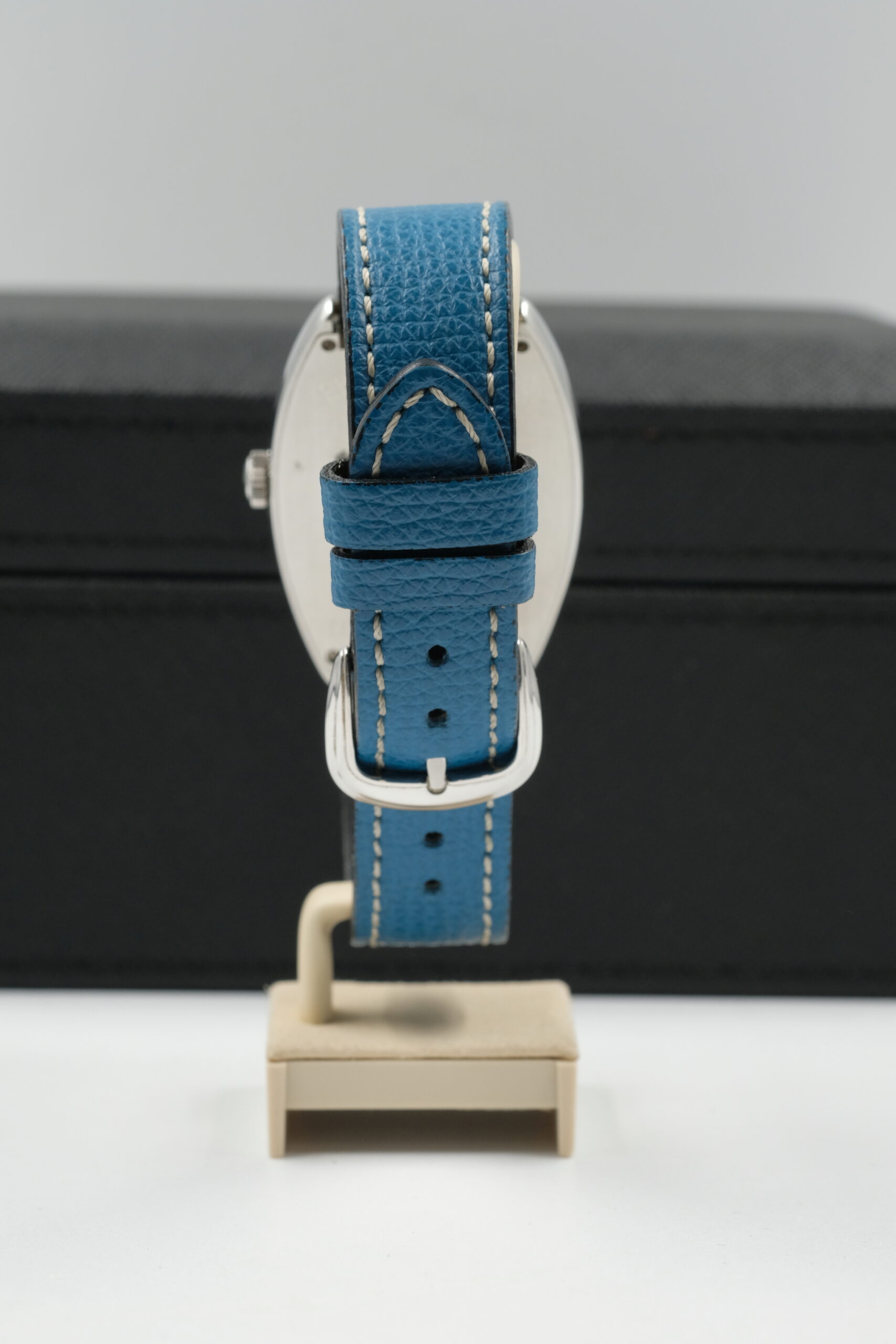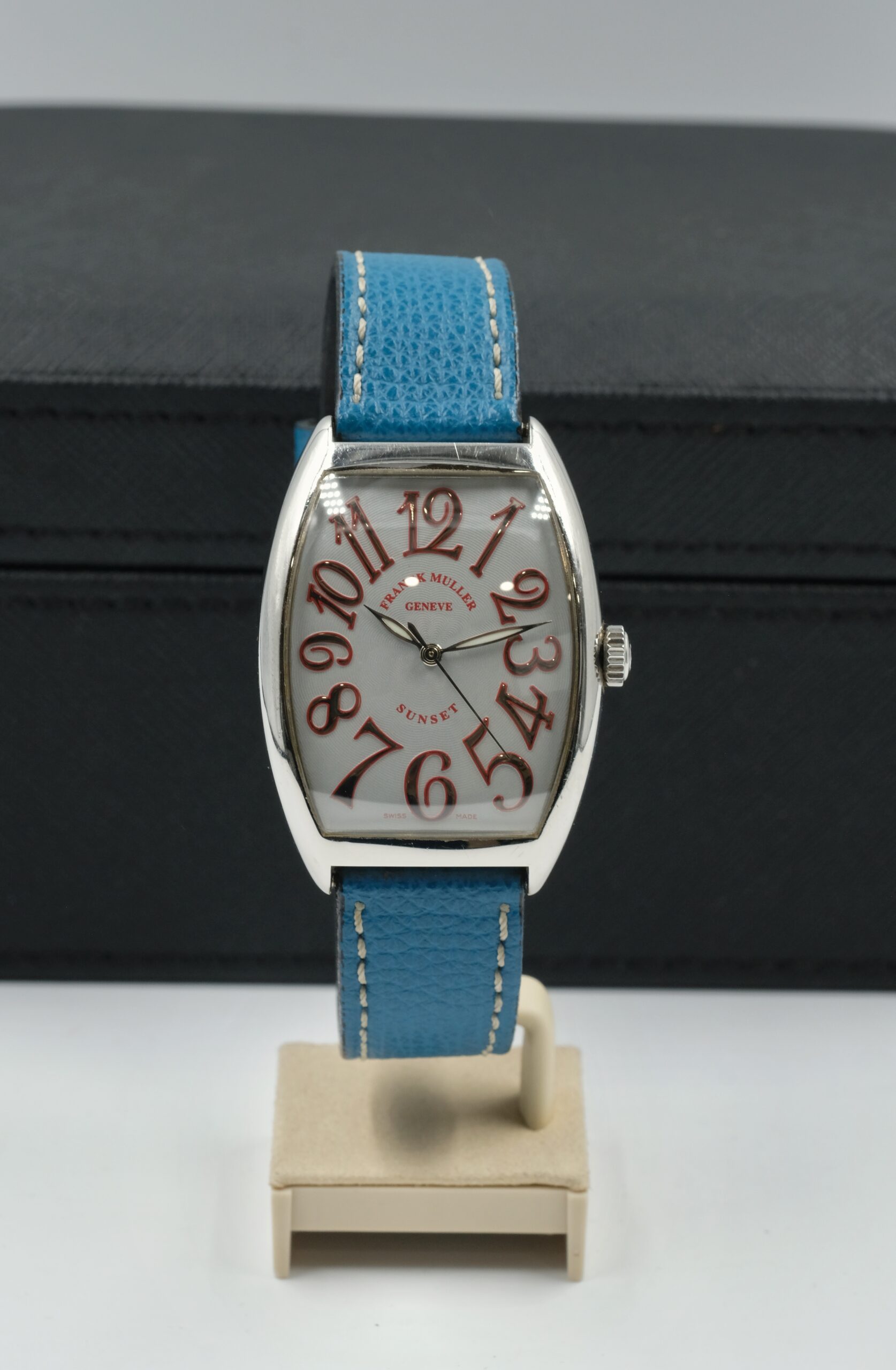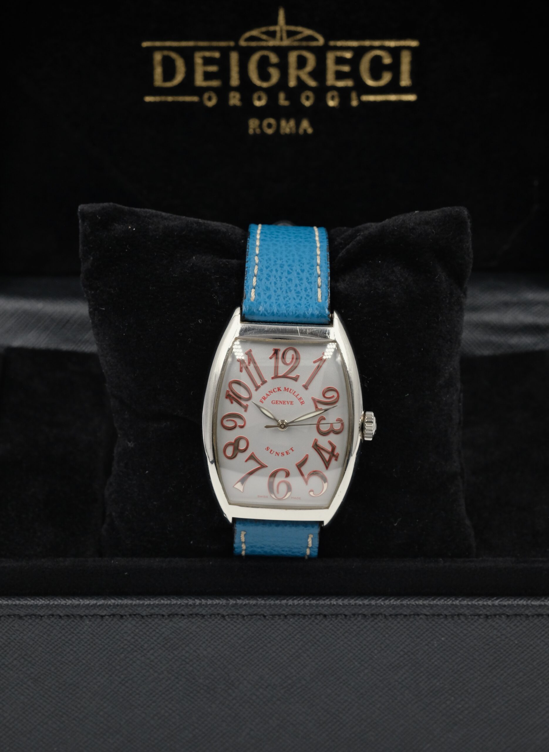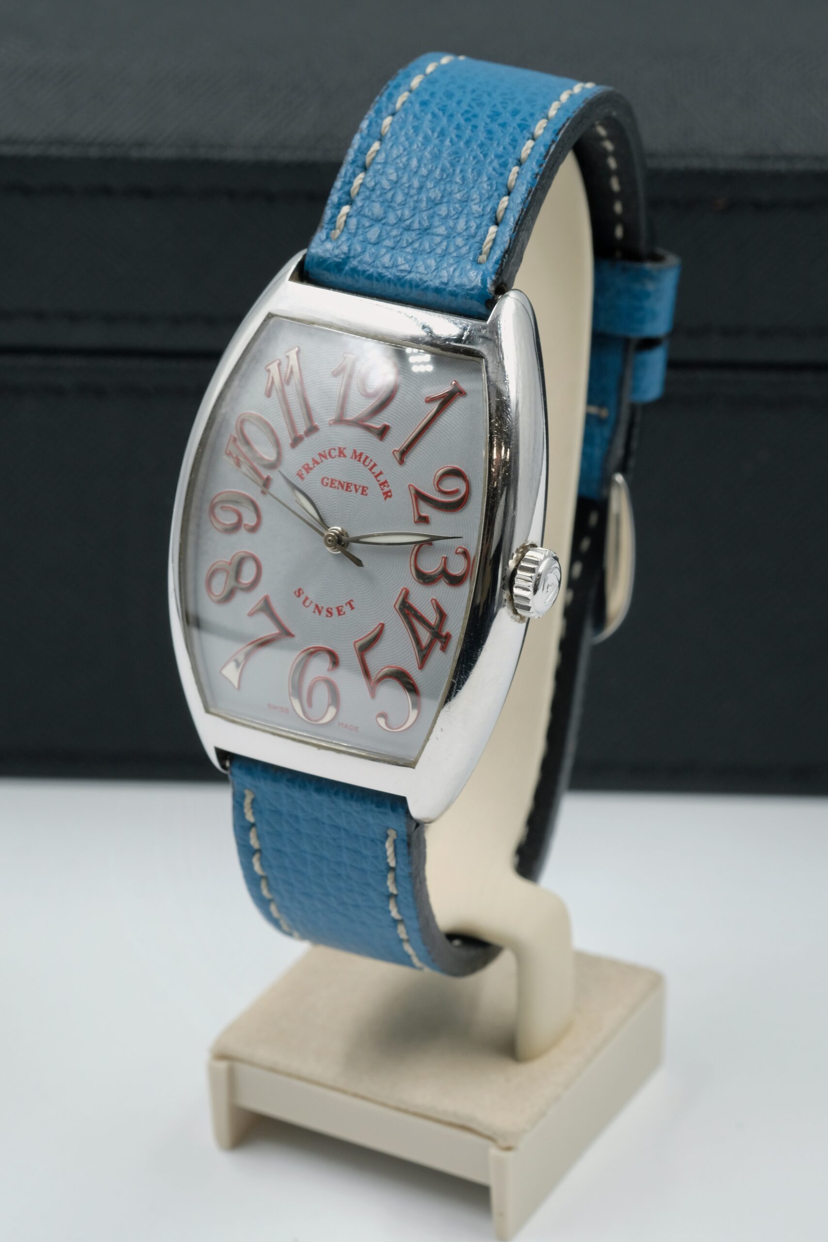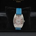 Edizione limitata 44/140, il Franck Muller 6850 SC Curvex Sunset in acciaio (47×34 mm) unisce iconica cassa tonneau e quadrante argento di forte identità. Movimento automatico e cinturino in pelle con chiusura ad ardiglione. Completo di scatola e garanzia del negozio.