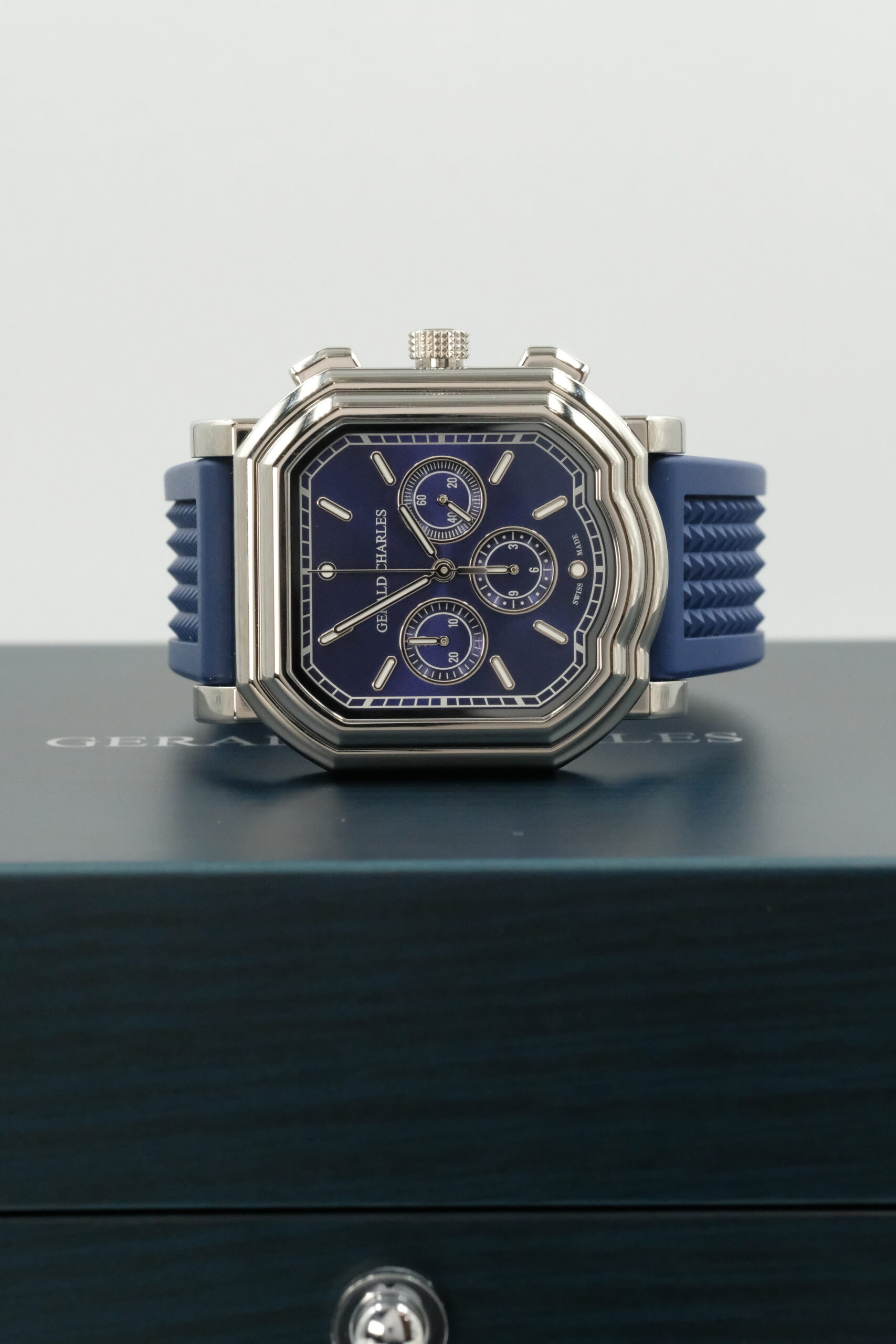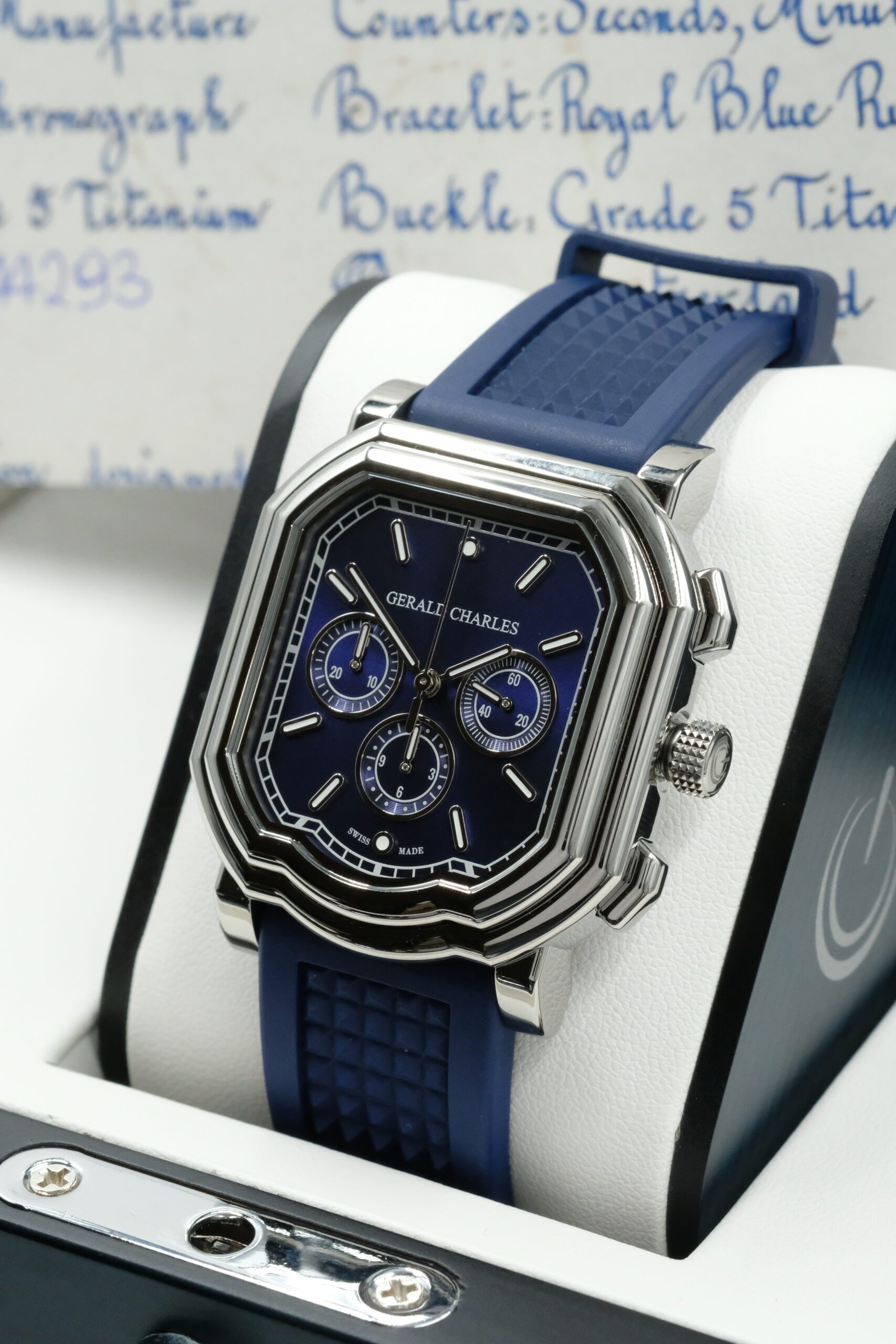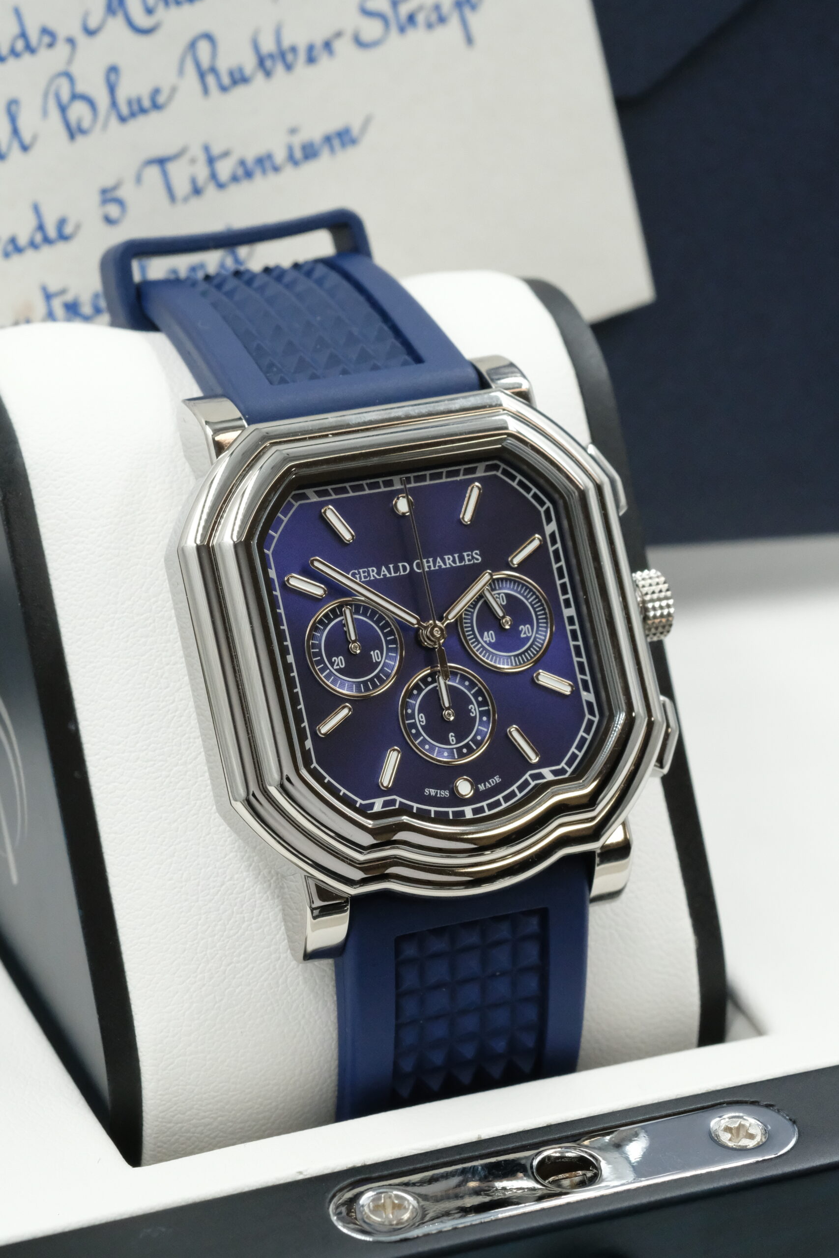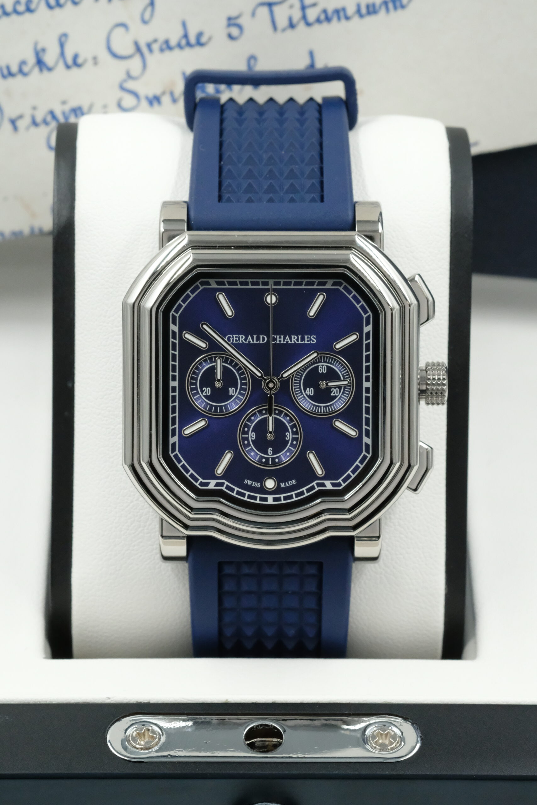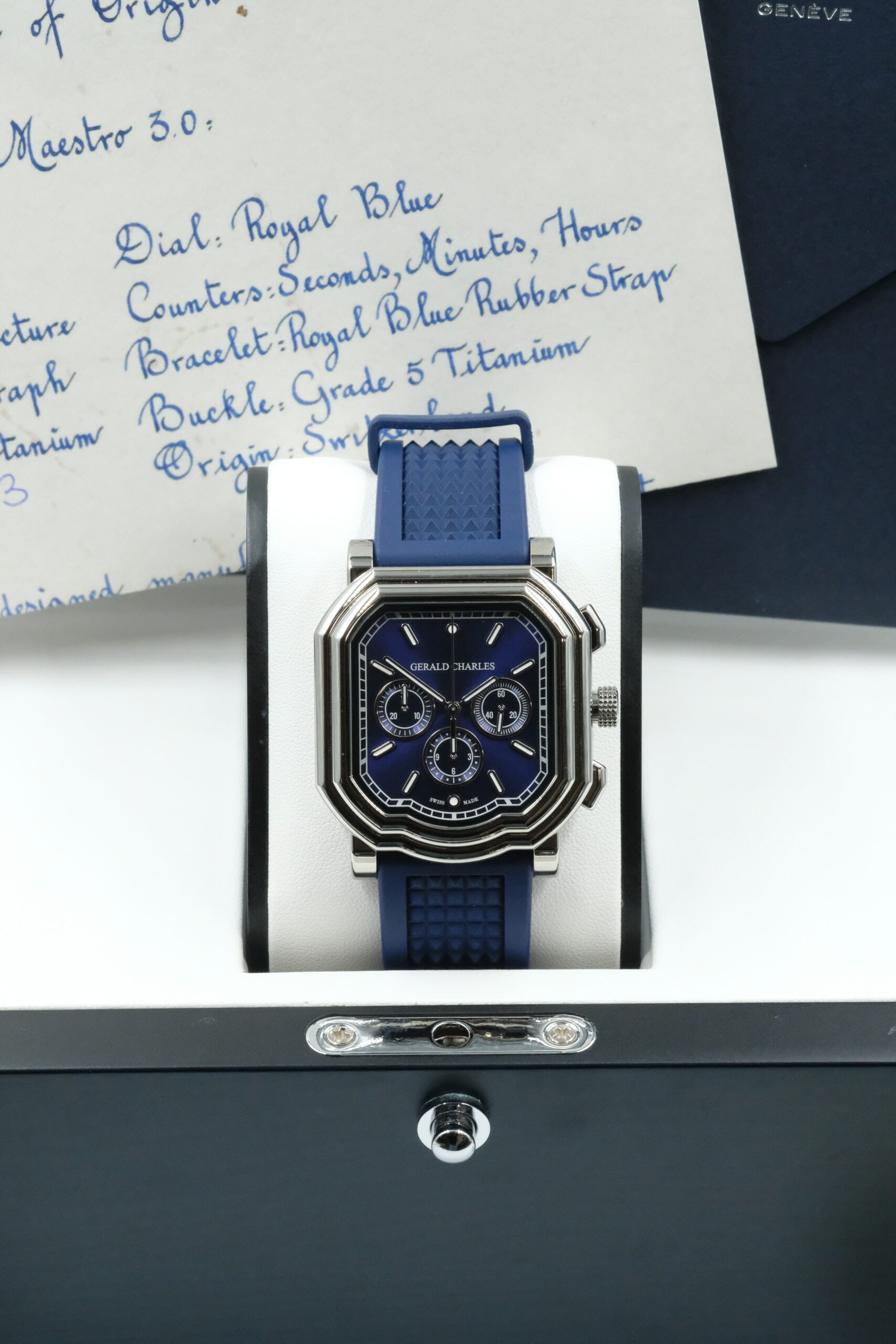 Gerald Charles Maestro 3.0 GC3.0-TN-01 2026 in titanio grado 5 con quadrante blu royal Sunburst. Cronografo automatico a doppia canna, impermeabile 100 m, design iconico e ultrapiatto. Full Set.