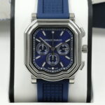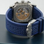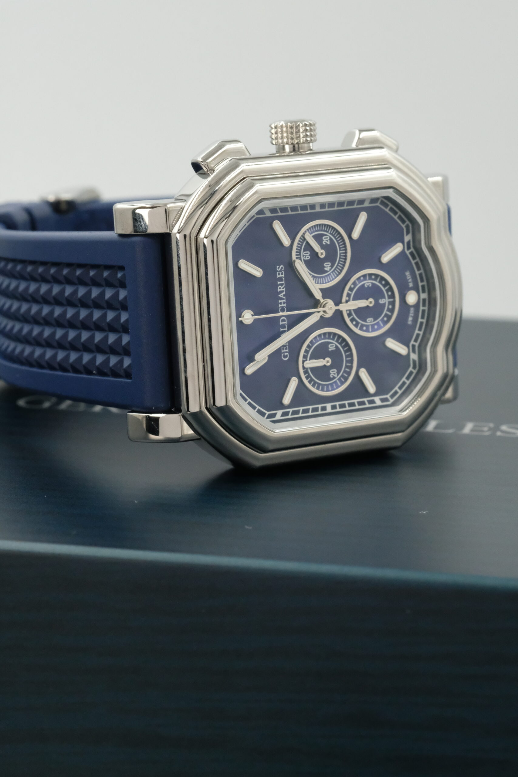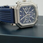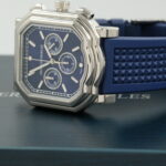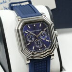 Gerald Charles Maestro 3.0 Cronografo referenza GC3.0-TN-01 anno 2026 rappresenta una delle espressioni più iconiche del design firmato Gérald Genta. La cassa sagomata da 39 × 41,7 mm in titanio grado 5, spessa solo 11,5 mm, è progettata per aderire perfettamente al polso, offrendo leggerezza e comfort eccezionali. Il quadrante blu royal Sunburst, con contatori cronografici a ore 3, 6 e 9, è completato da indici e lancette con Super-LumiNova. Animato dal calibro cronografo automatico GCA3022/12 a doppia canna con 50 ore di riserva di carica, visibile attraverso fondello in zaffiro, è impermeabile fino a 100 metri e abbinato a cinturino in gomma tecnica blu. Un segnatempo d’avanguardia, raffinato e altamente tecnico.