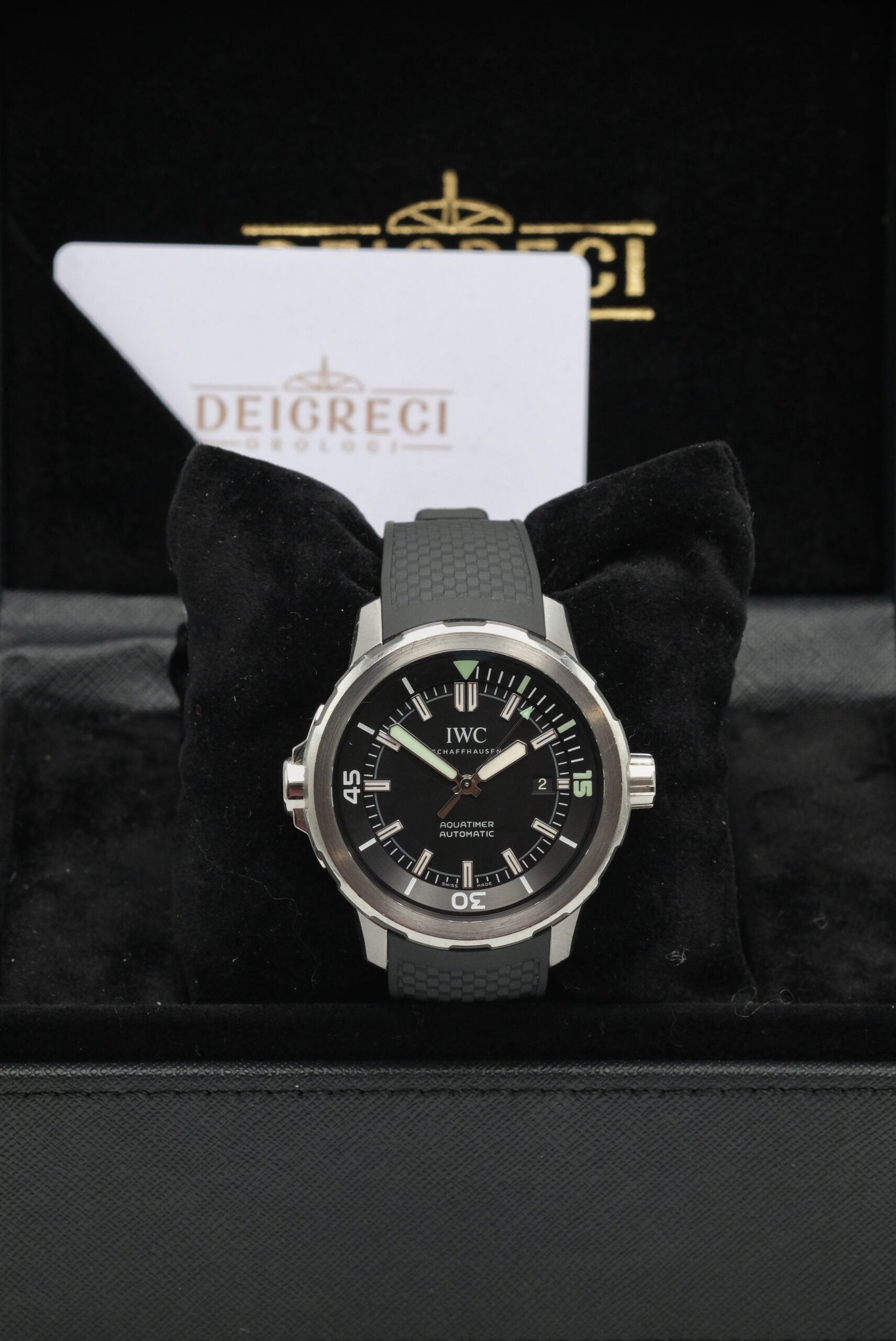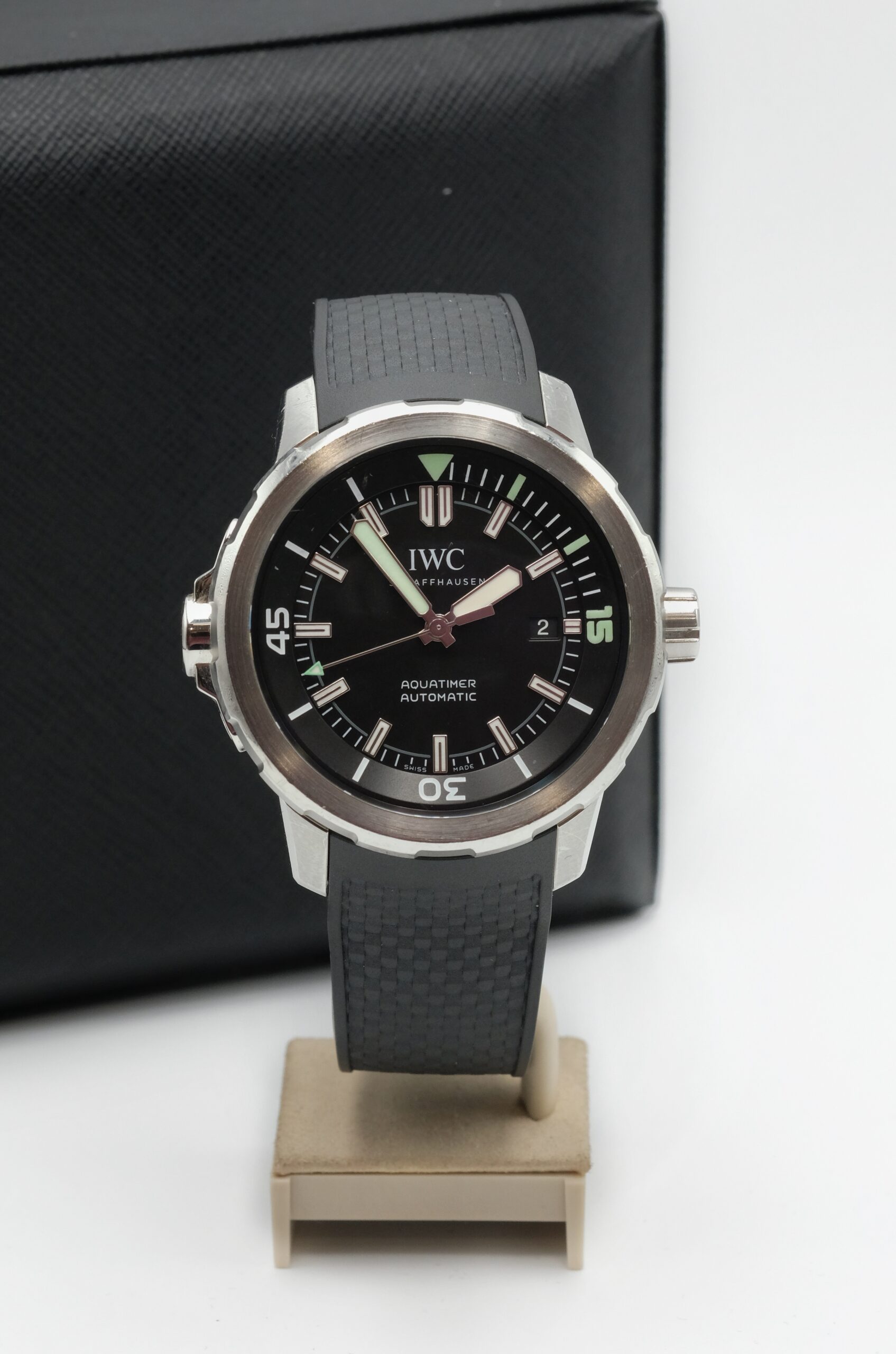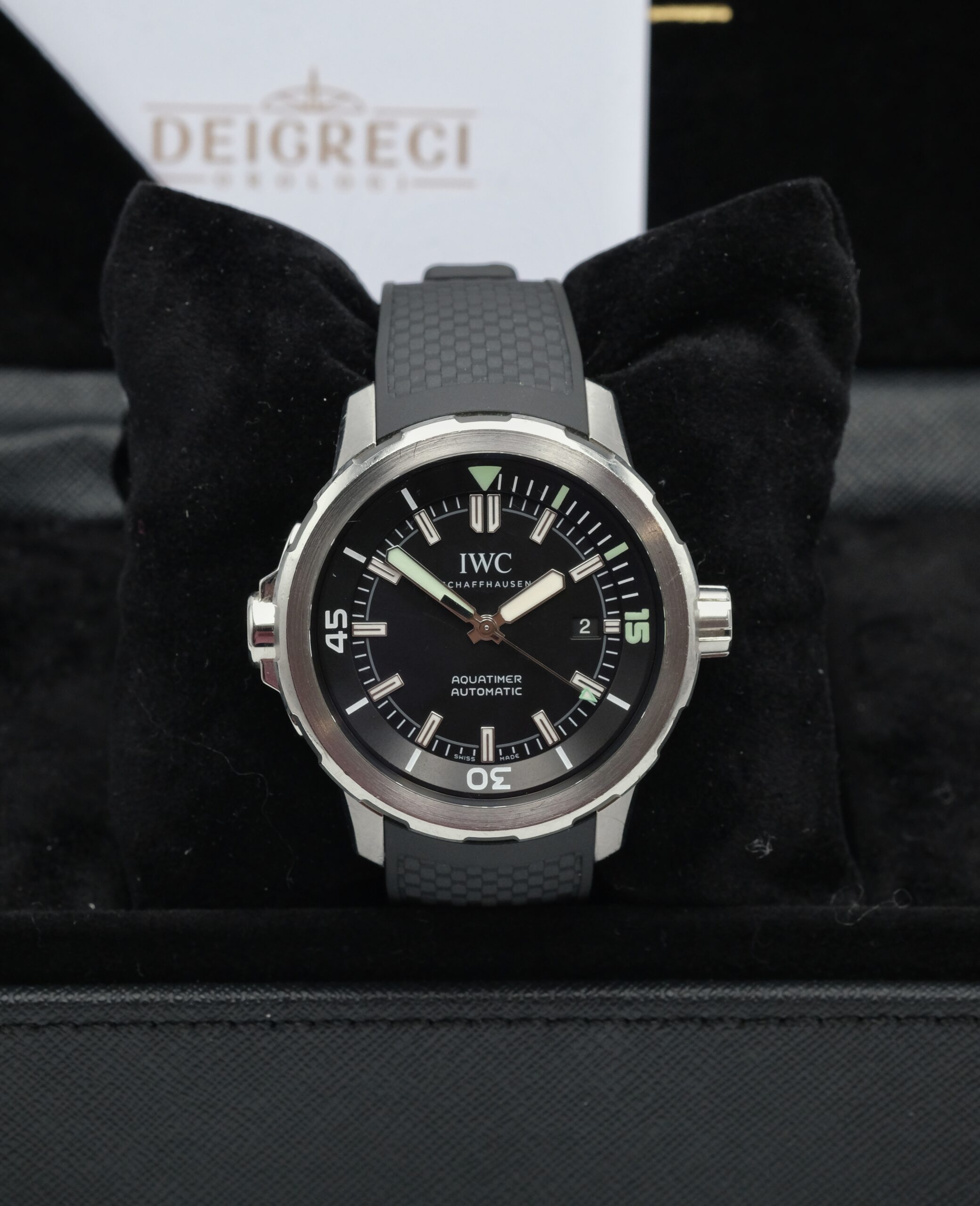 IWC Aquatimer Automatic IW329001 in acciaio 42 mm, quadrante nero, cinturino in gomma e movimento automatico. Impermeabile 30 ATM, con scatola e garanzia del negozio.