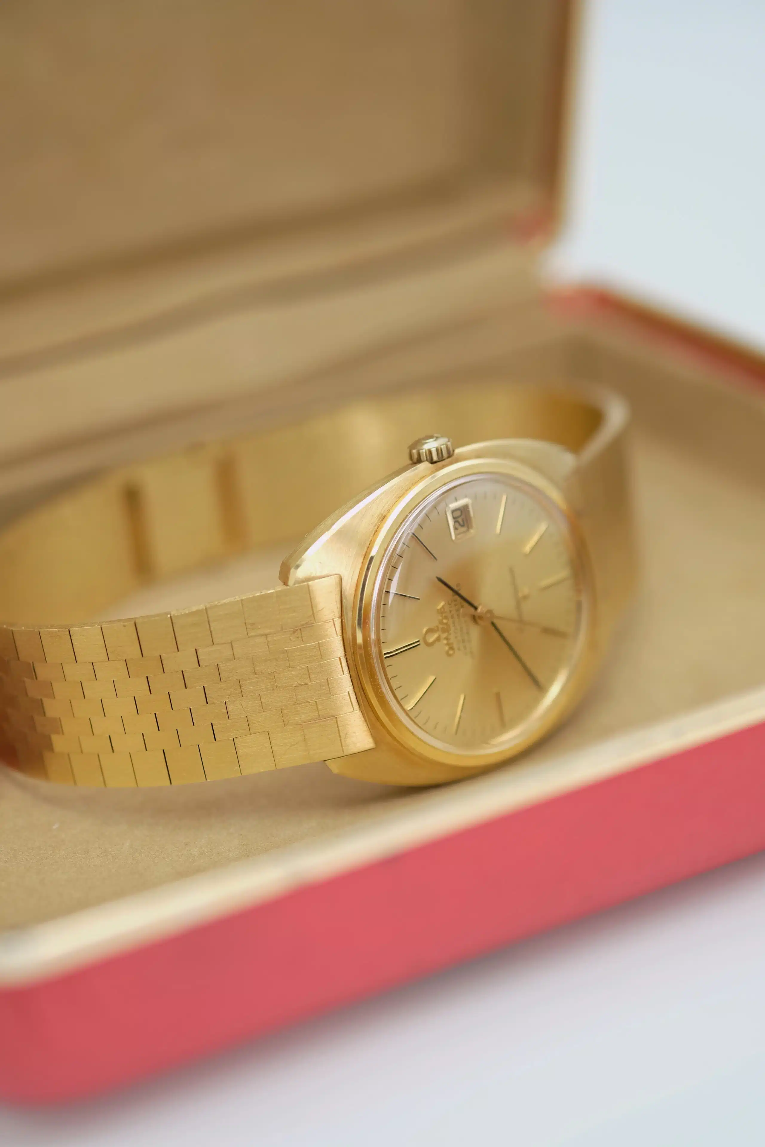 Omega Constellation 168.009 in oro giallo 18 kt, calibro automatico 564, quadrante oro e bracciale D’Agosto NOS da 120 g. Con scatola originale, €12.500