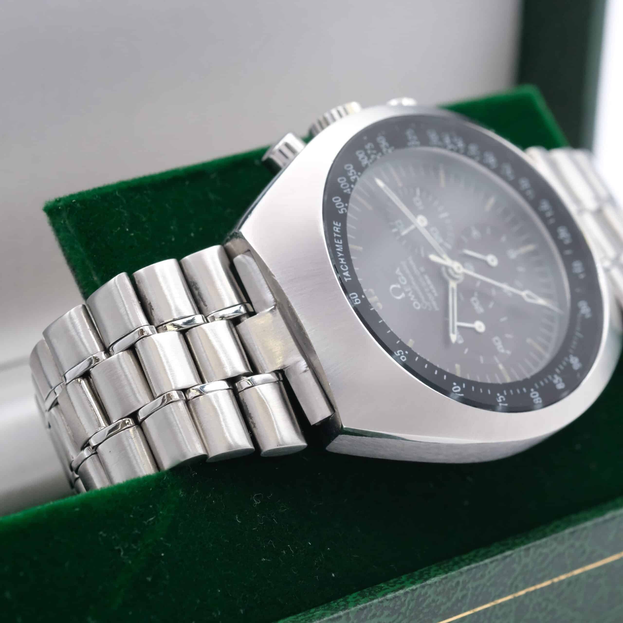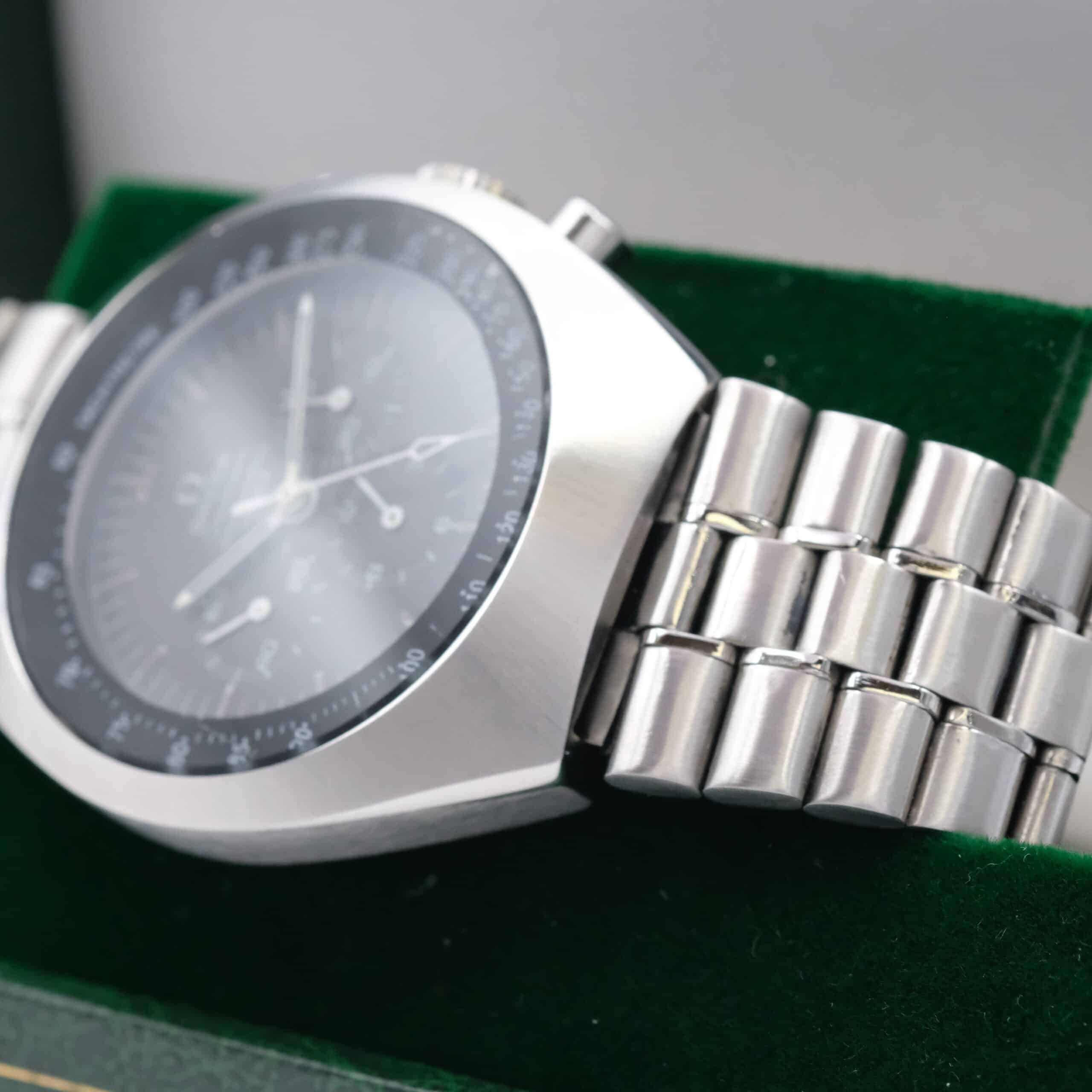 Omega Speedmaster Mark II Ref. 145.014 con cassa tonneau e cinturino in pelle nera con cuciture gialle. Venduto con scatola e garanzia 24 mesi.