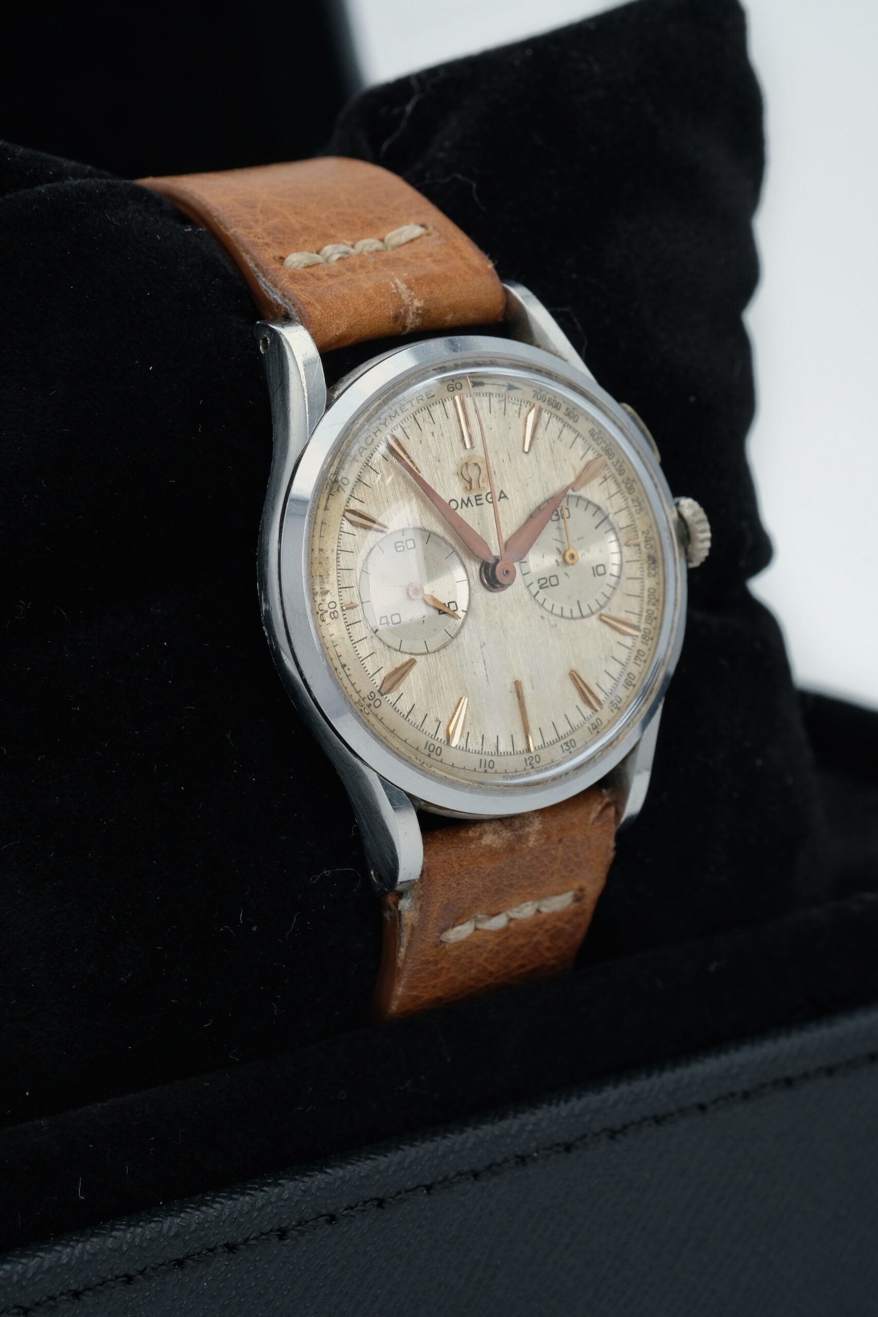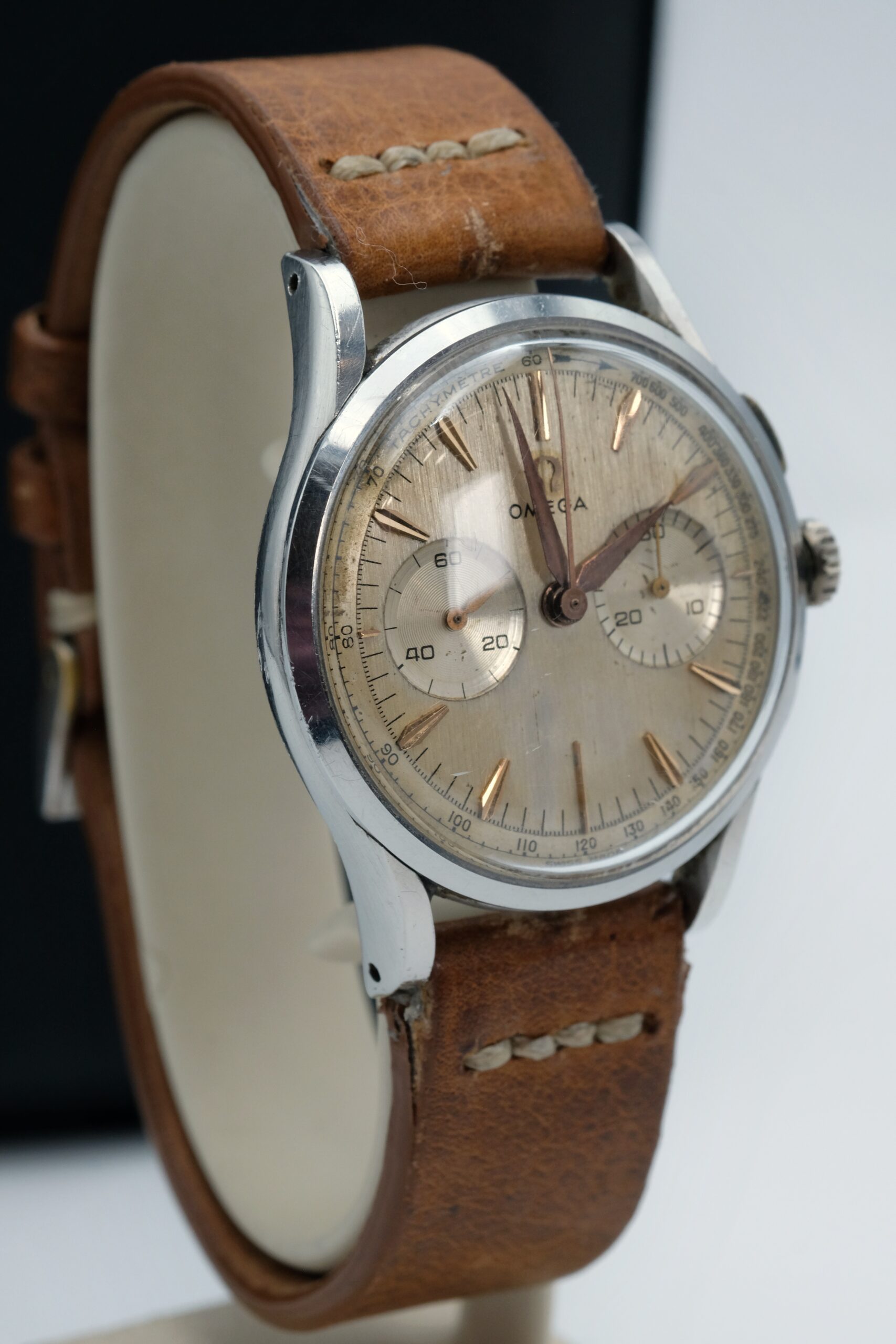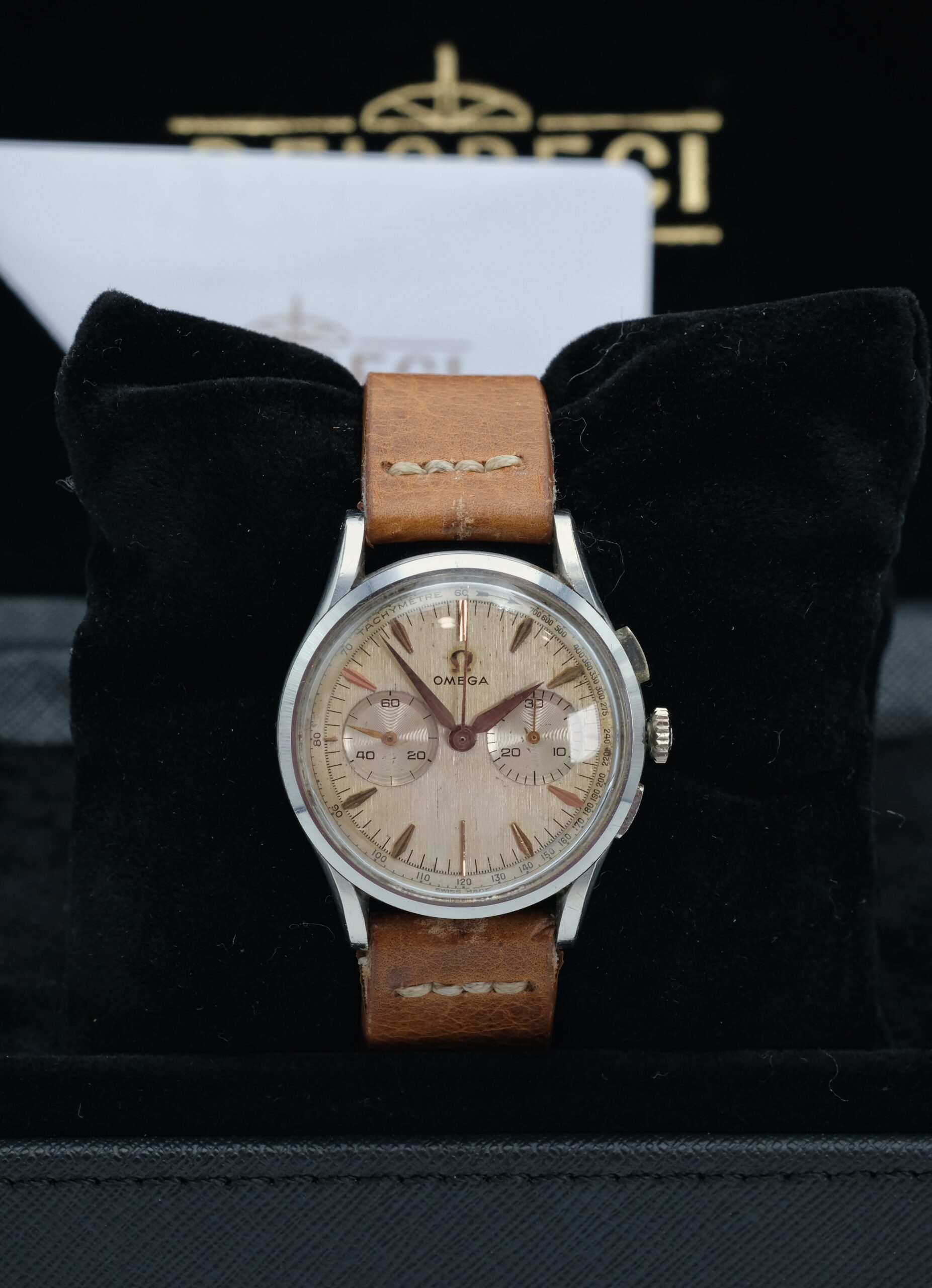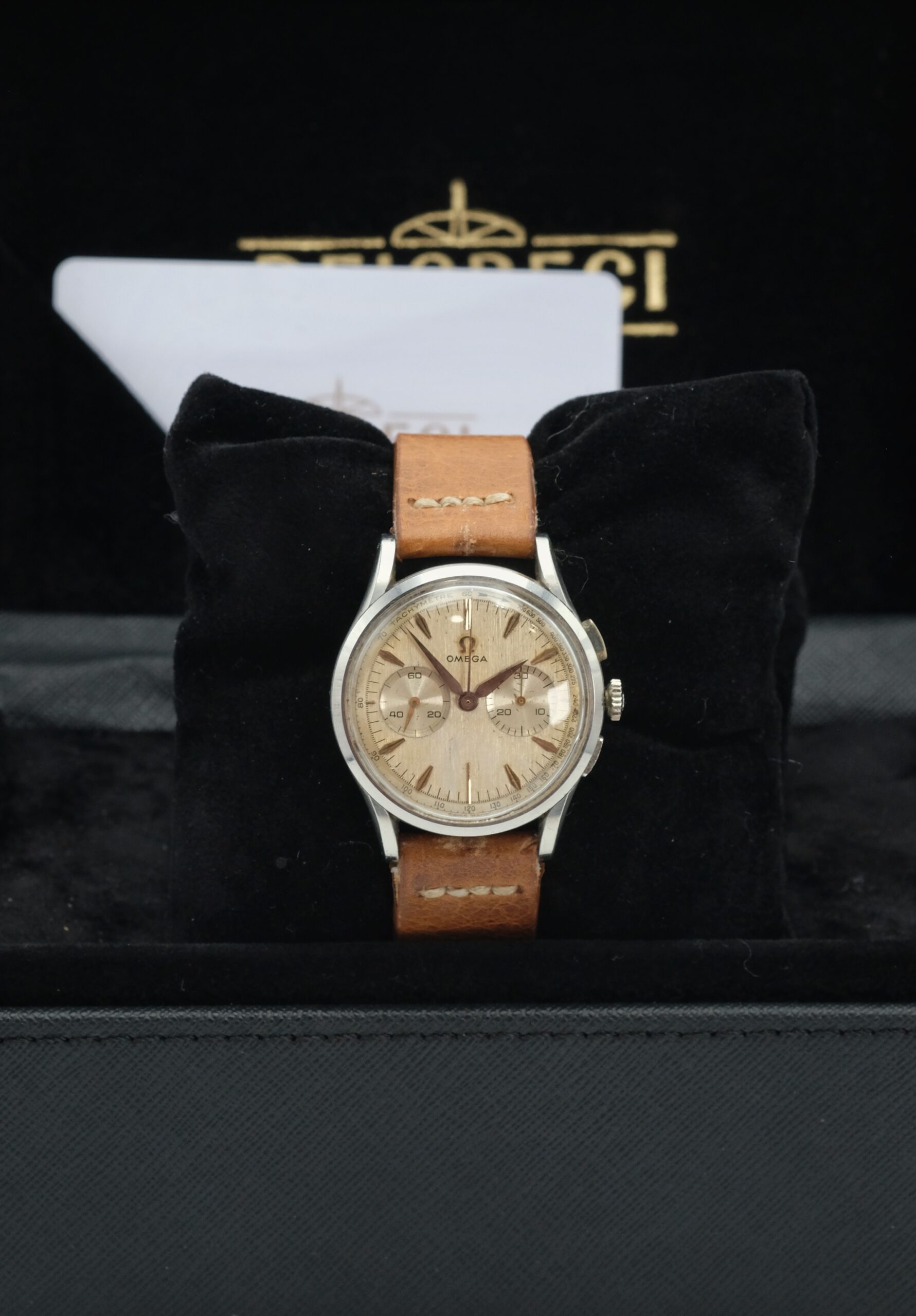 Omega Vintage Chrono 2463 a carica manuale con cassa in acciaio da 33 mm, quadrante argento e cinturino in pelle. Un classico vintage di grande eleganza.