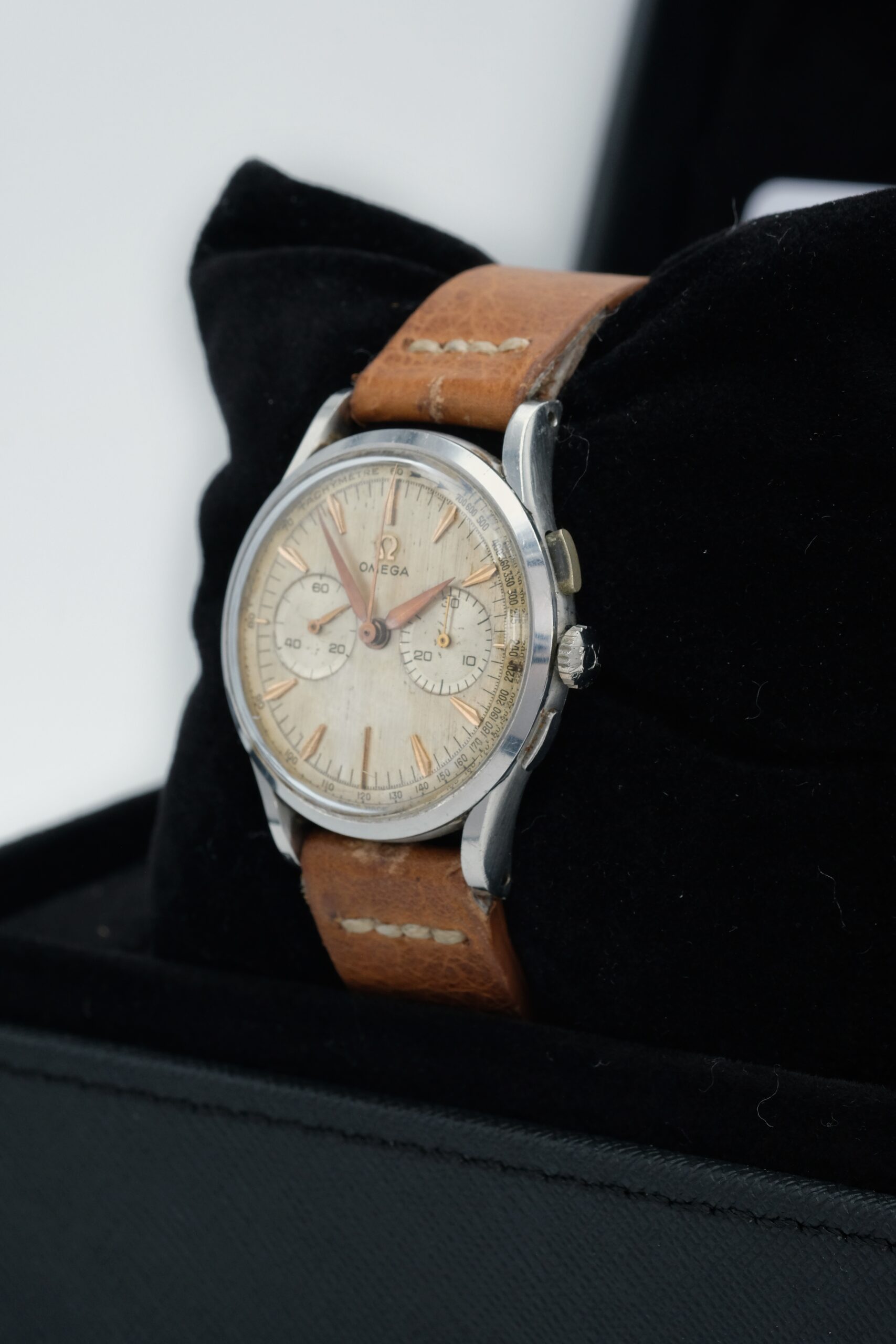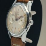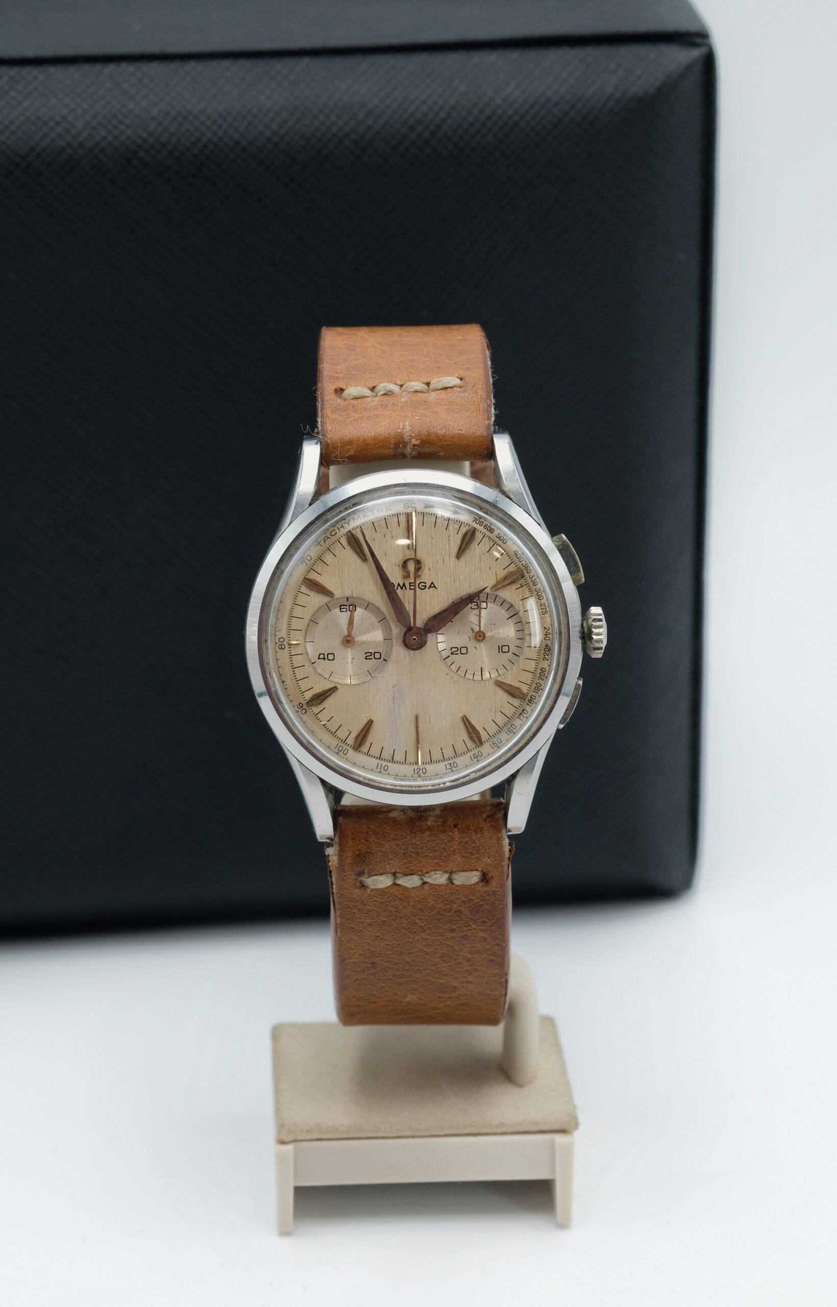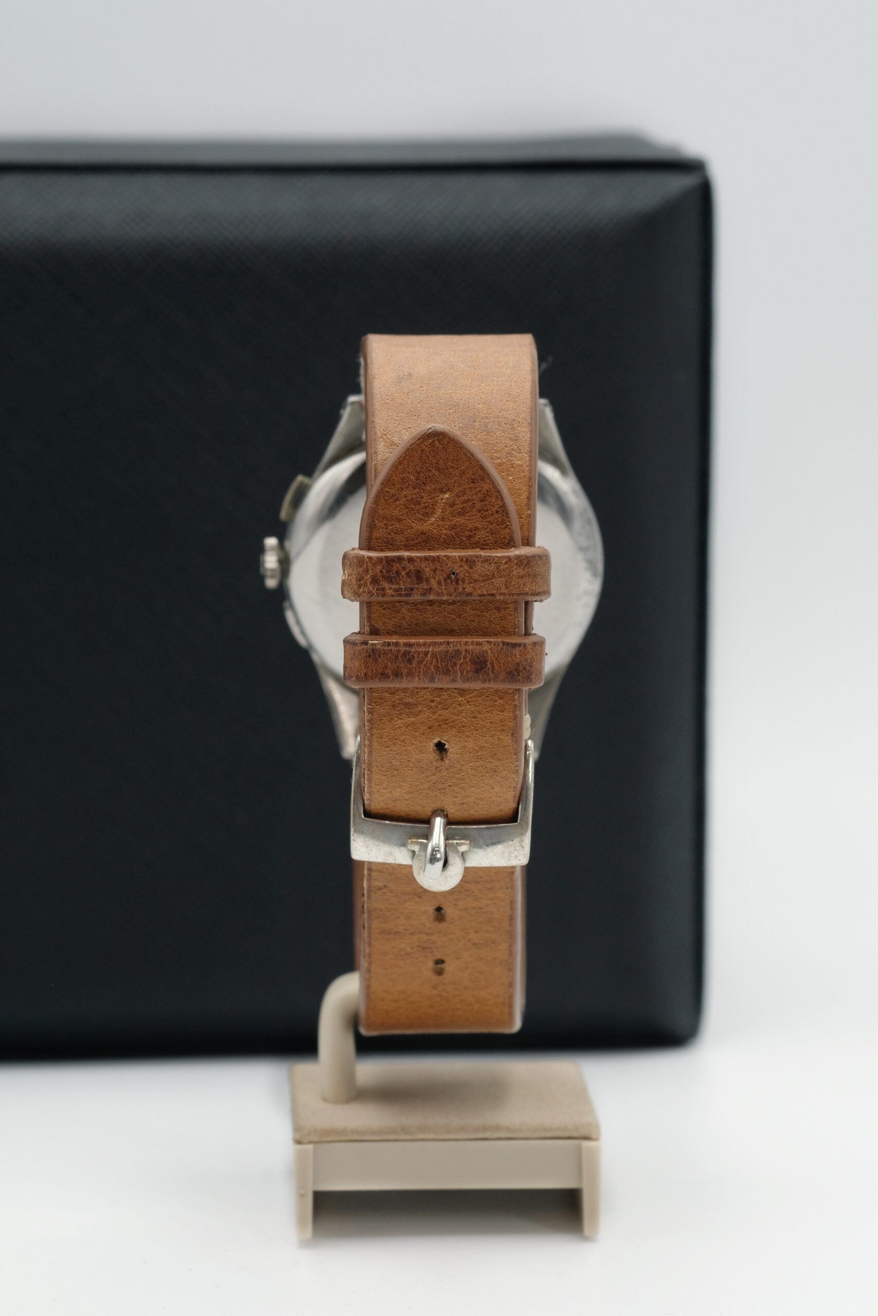 Omega Vintage Chrono 2463 a carica manuale con cassa in acciaio da 33 mm, quadrante argento e cinturino in pelle. Un classico vintage di grande eleganza.