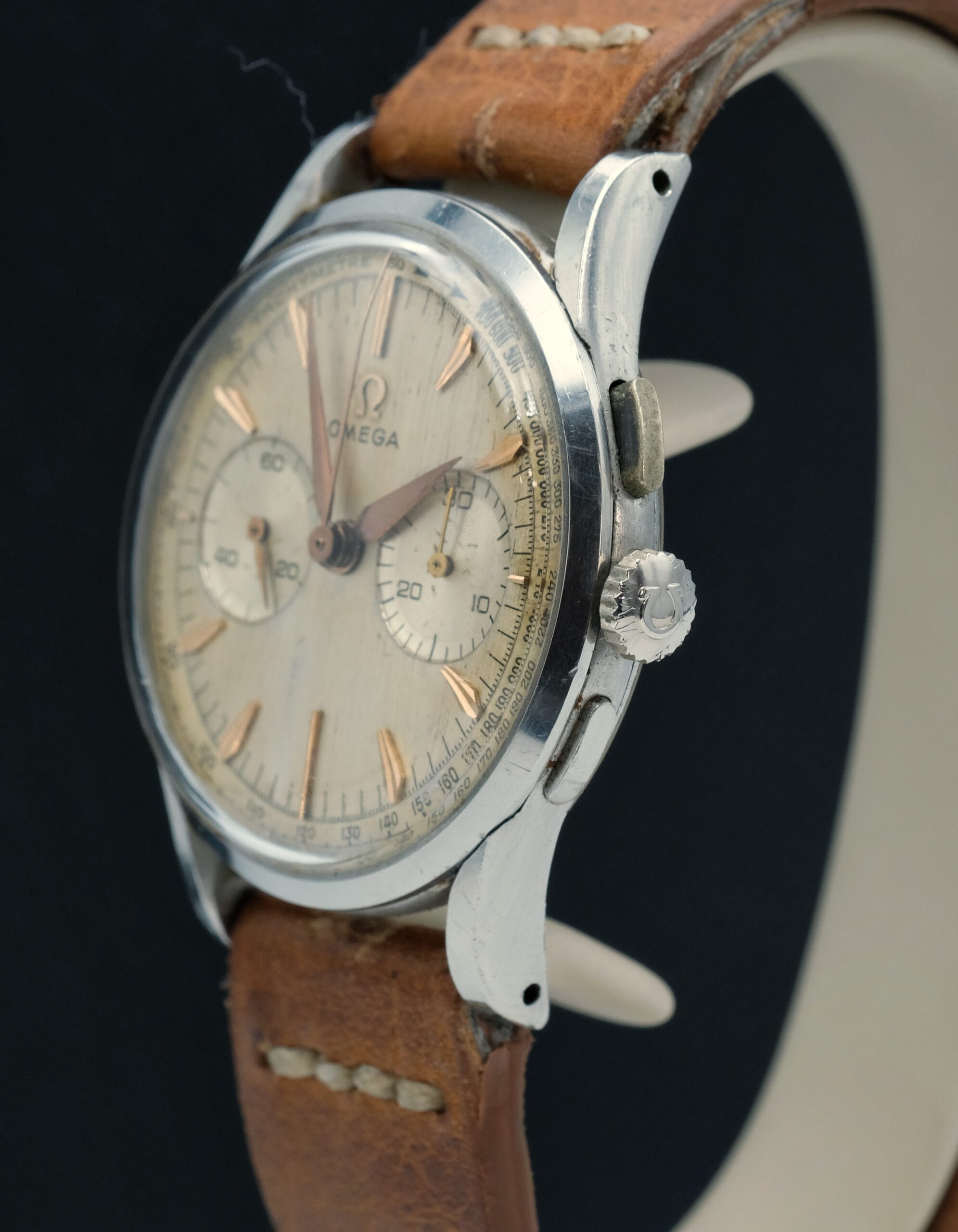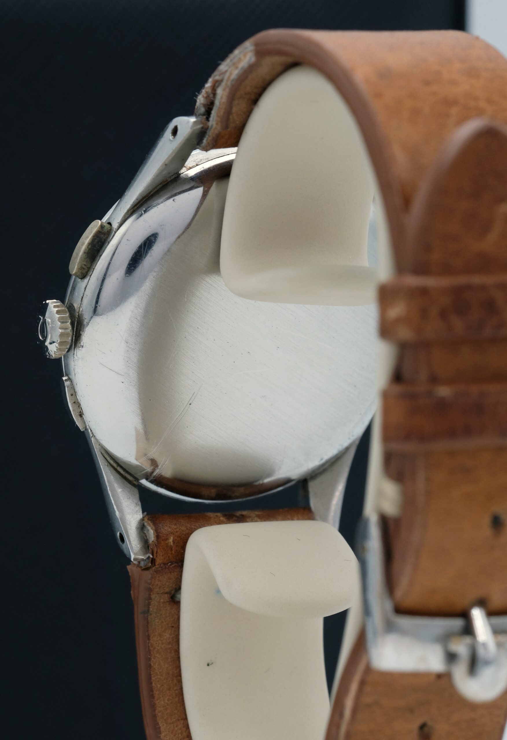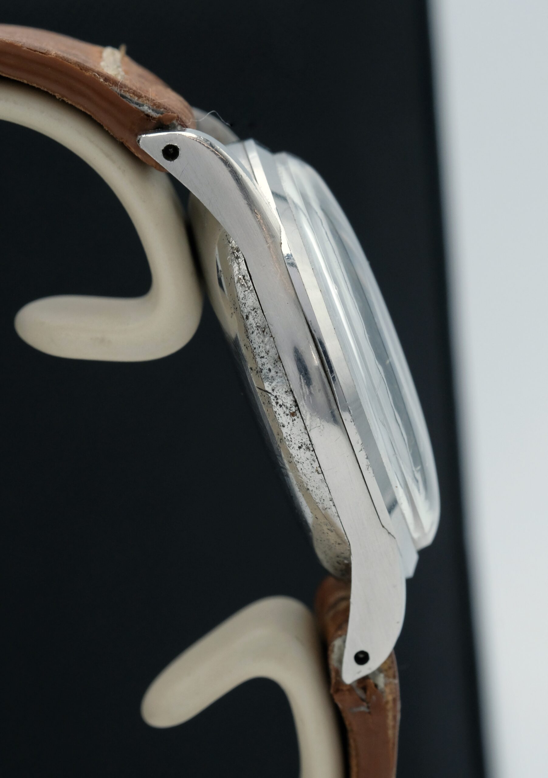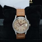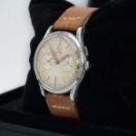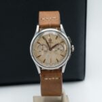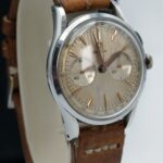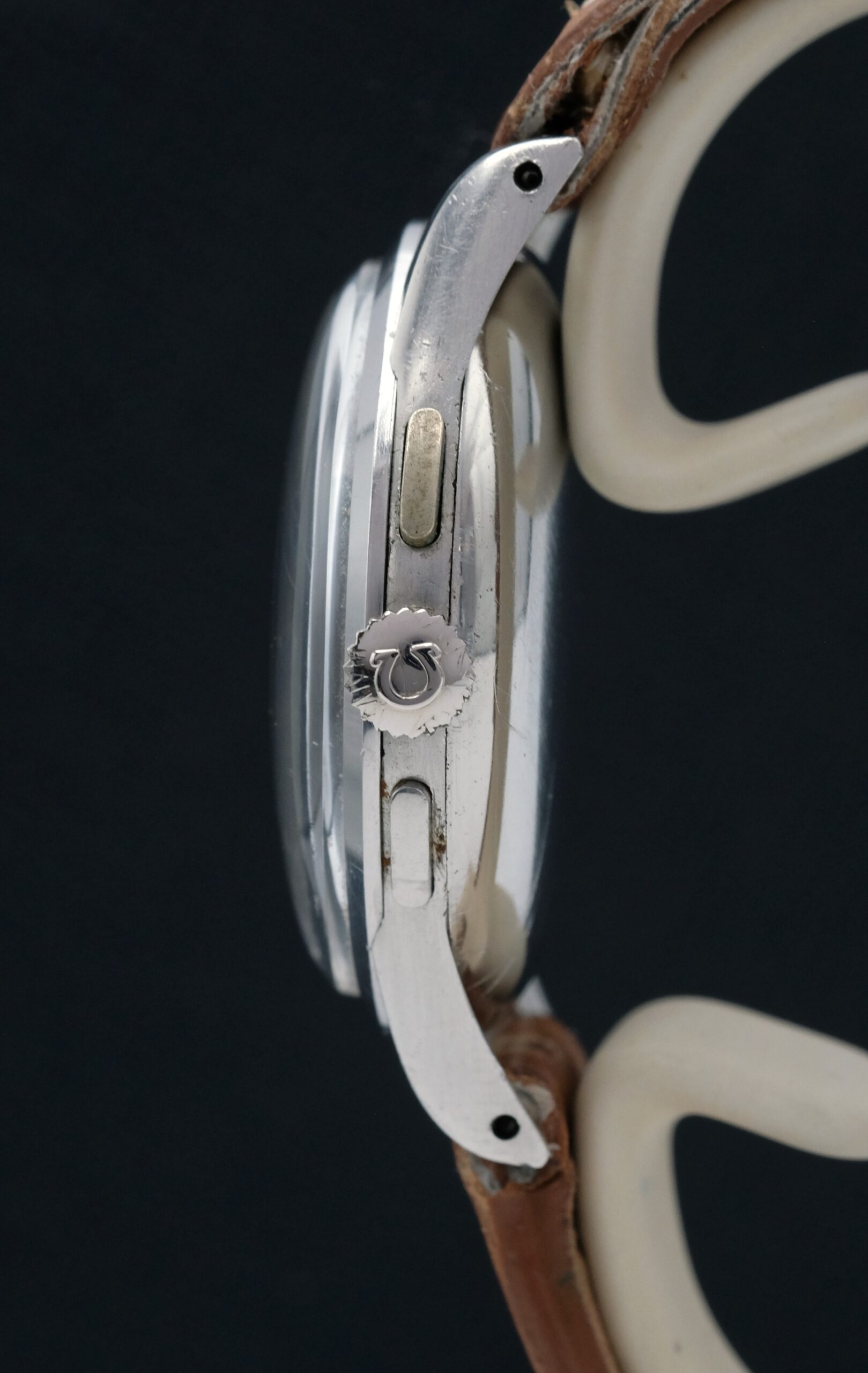 Omega Vintage Chrono 2463 a carica manuale con cassa in acciaio da 33 mm, quadrante argento e cinturino in pelle. Un classico vintage di grande eleganza.