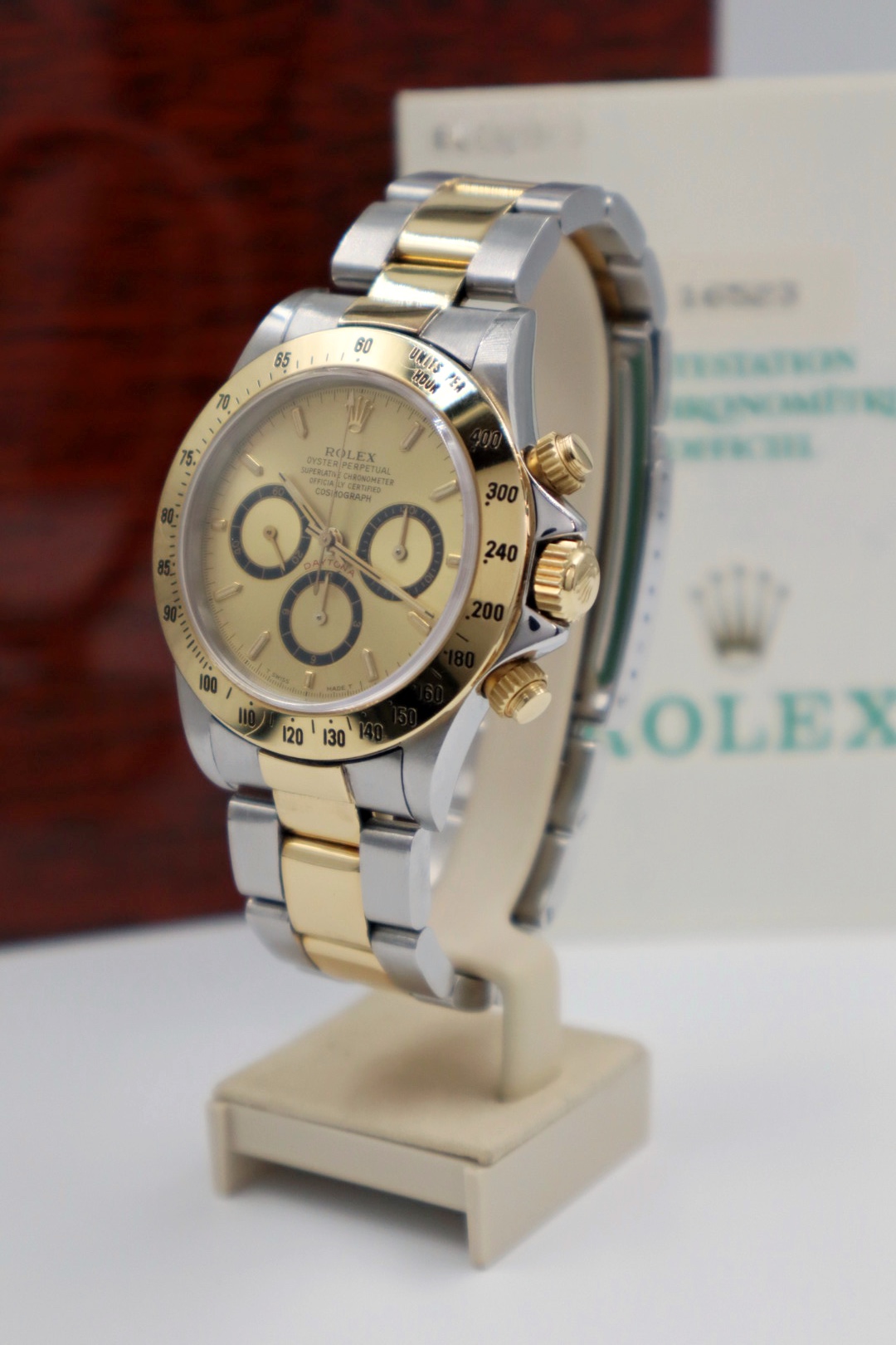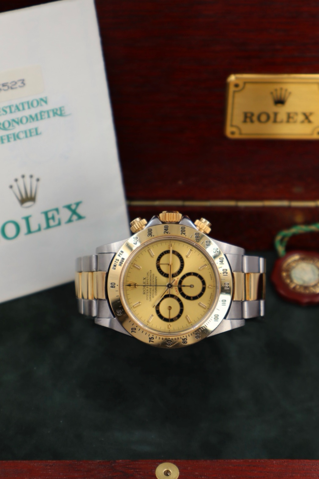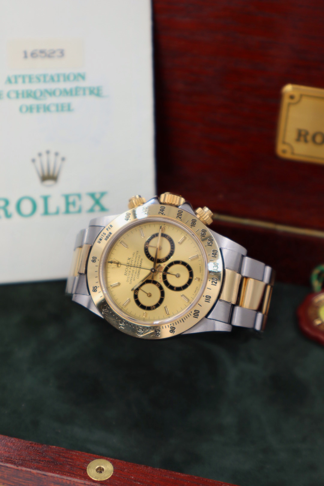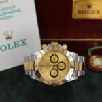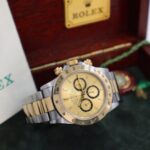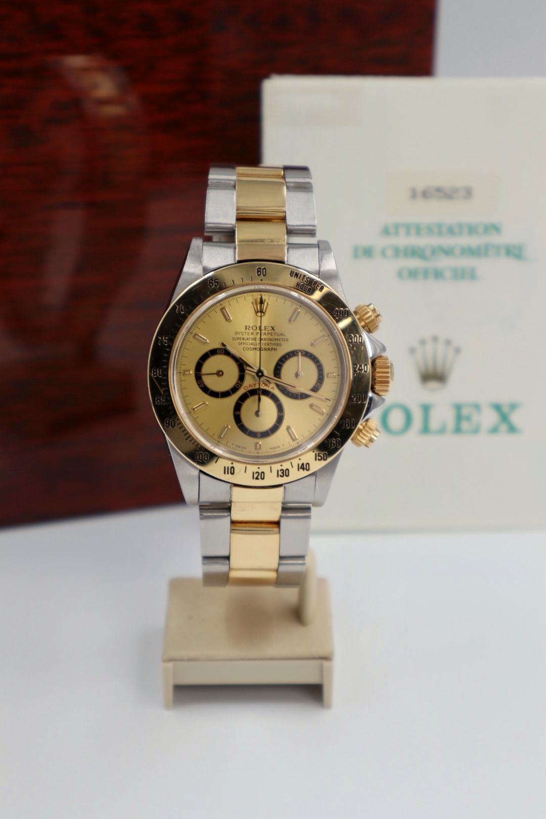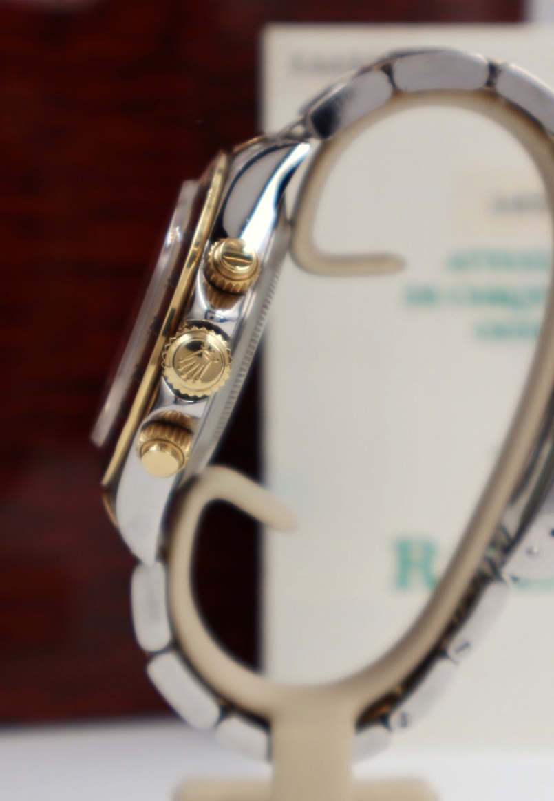 Iconico Rolex Daytona 16523 del 1991 con movimento Zenith e quadrante champagne. Esemplare in condizioni eccellenti con bollino verde, completo di bracciale Oyster, scatola e documenti originali dell’epoca.