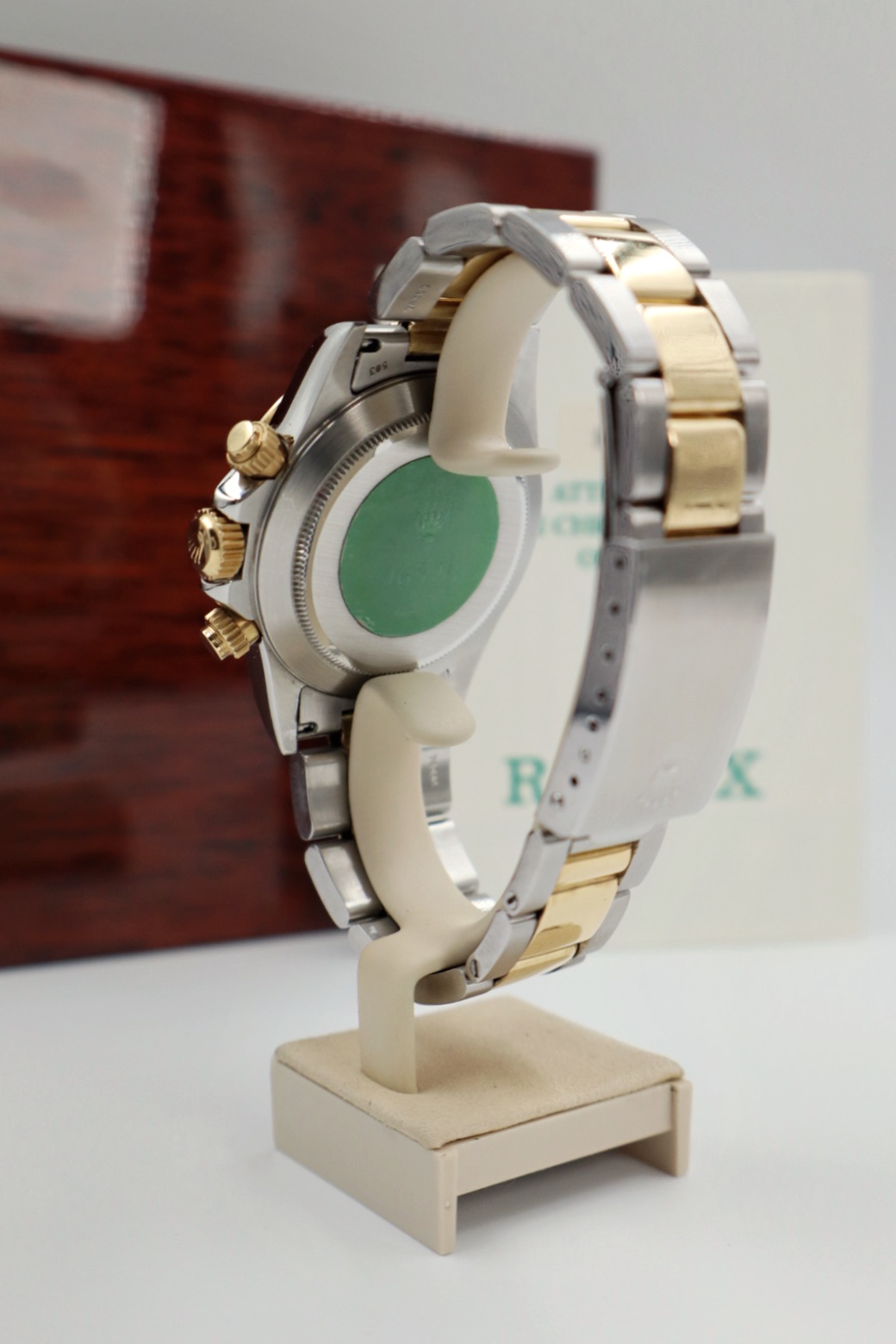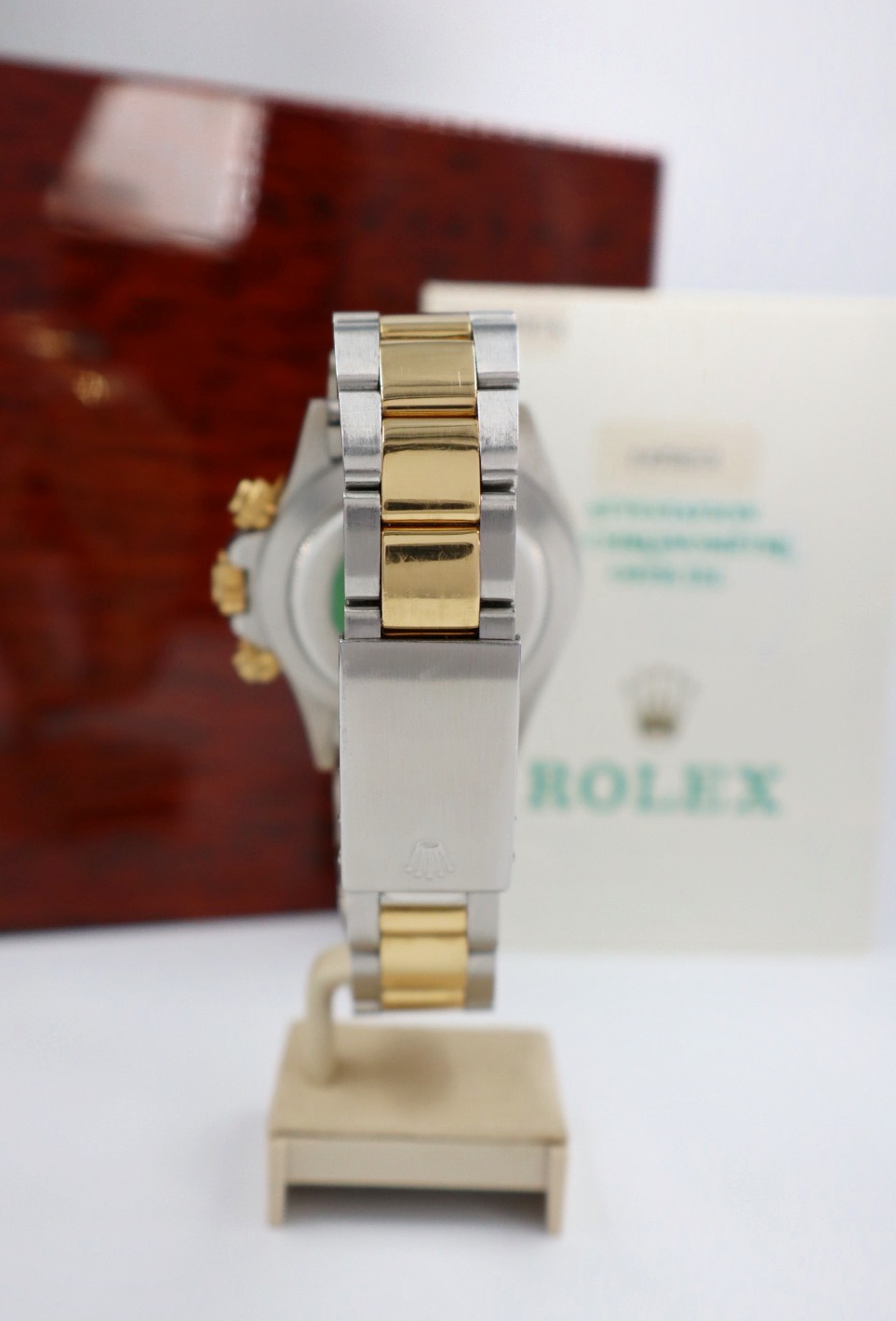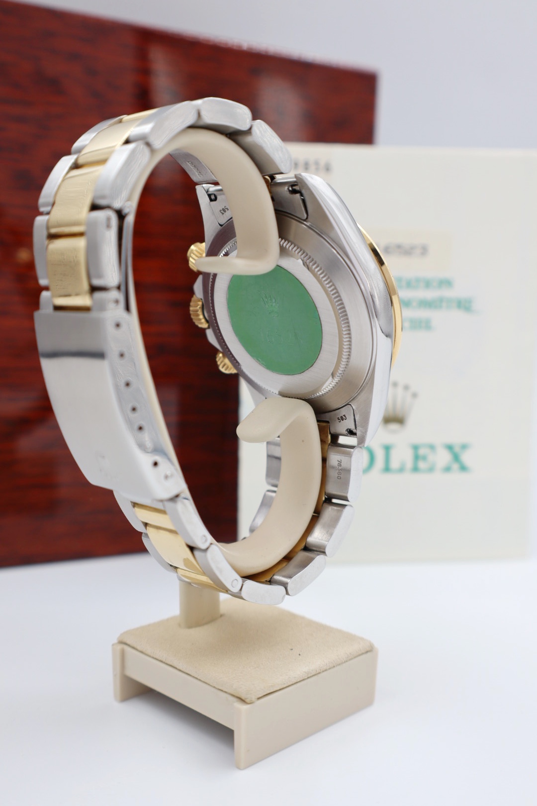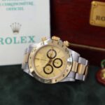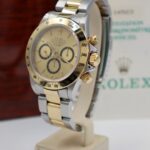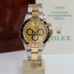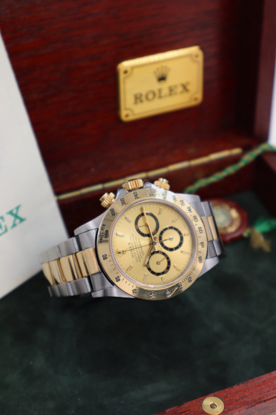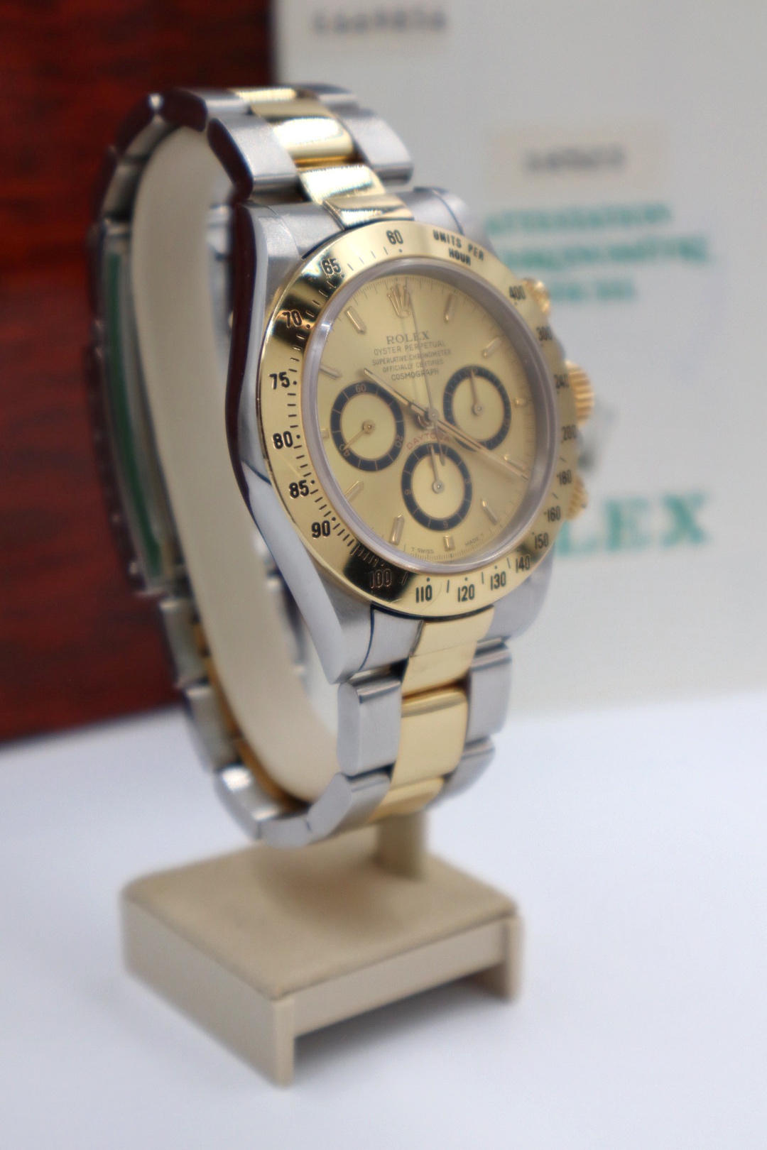 Iconico Rolex Daytona 16523 del 1991 con movimento Zenith e quadrante champagne. Esemplare in condizioni eccellenti con bollino verde, completo di bracciale Oyster, scatola e documenti originali dell’epoca.