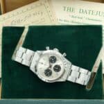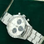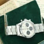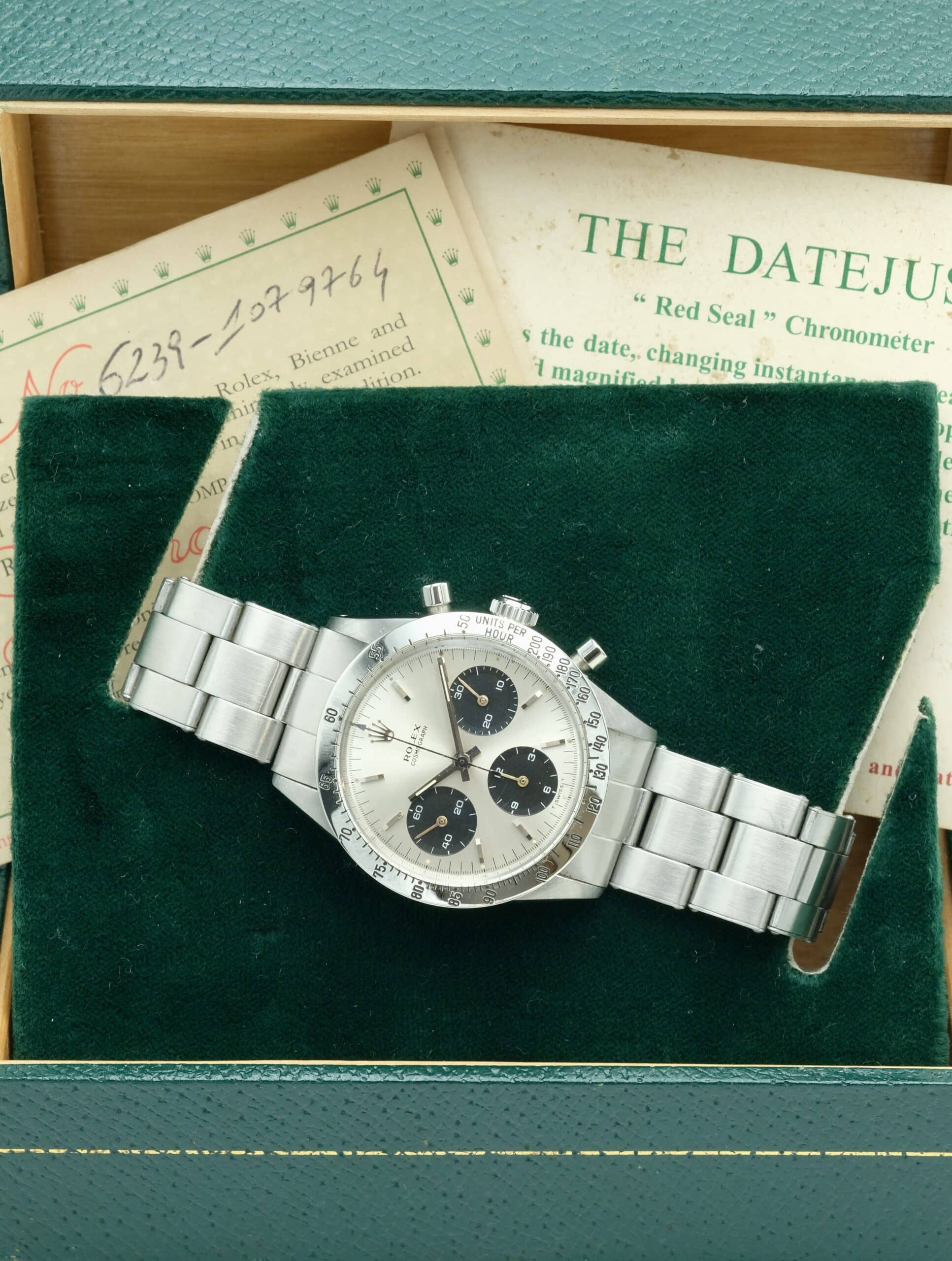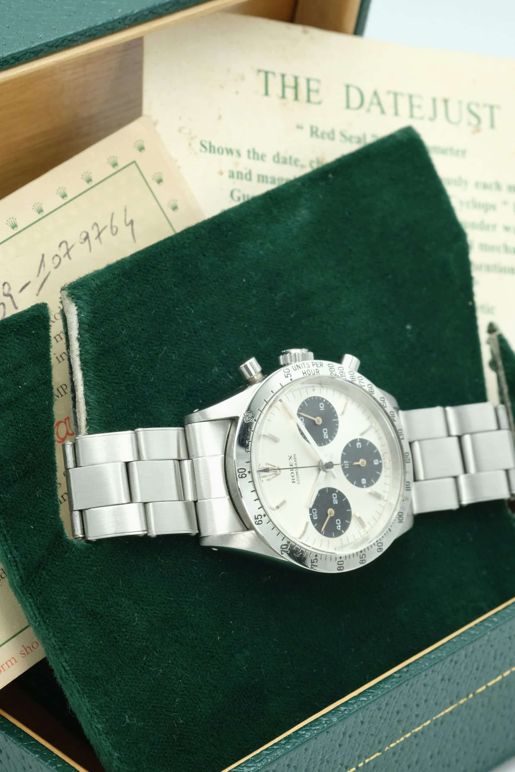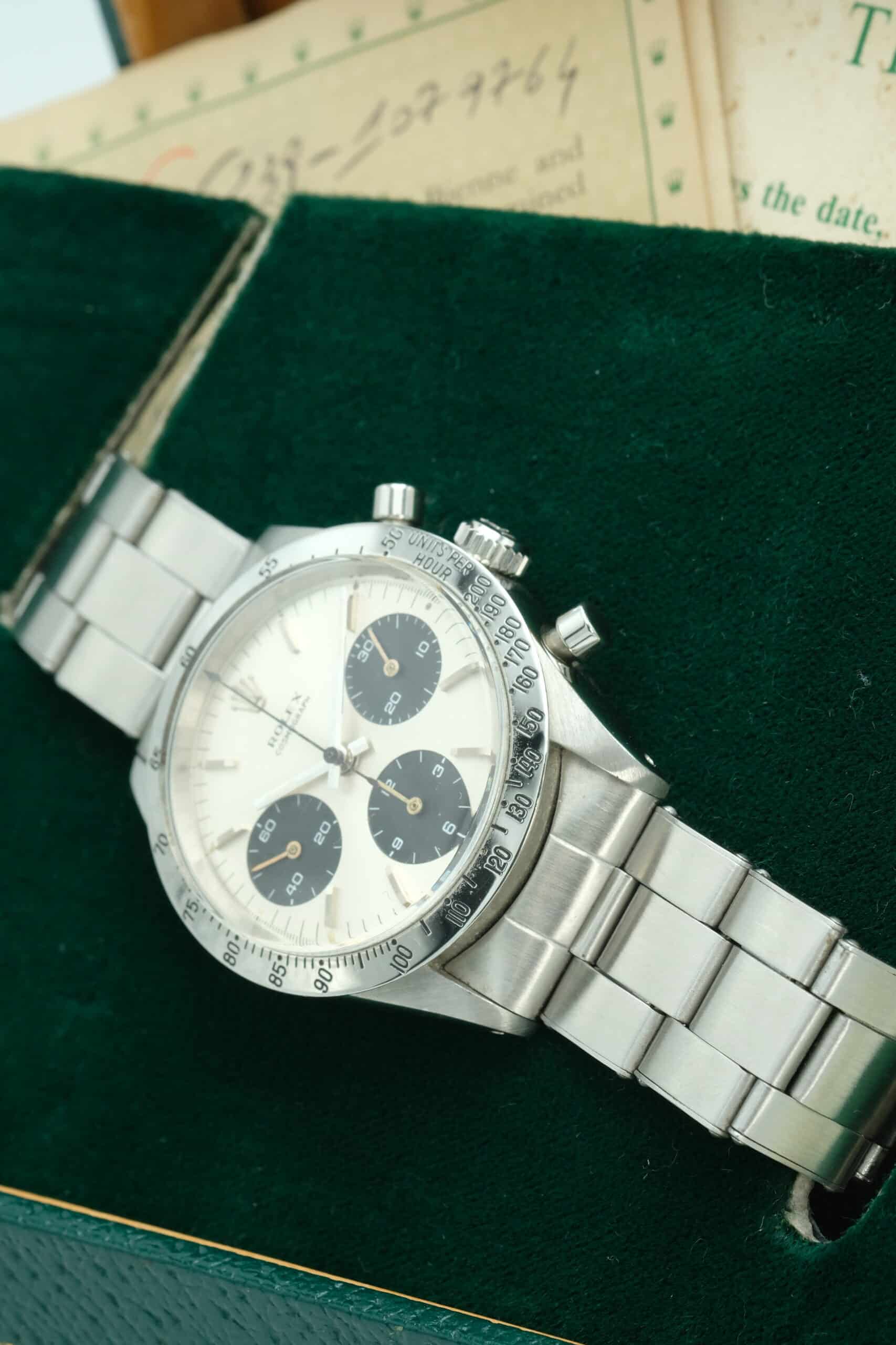 Rolex Daytona Ref. 6239 anno 1964, prima serie, acciaio 37 mm, quadrante argentato, ghiera tachimetrica incisa. Con scatola e garanzia originale Rolex.