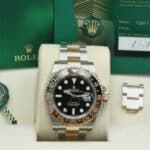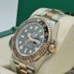 Il Rolex GMT-Master II Ref. 126711CHNR, conosciuto dagli appassionati come “Root Beer”, è un’icona contemporanea della maison coronata. Questo esemplare, full set del dicembre 2024, si presenta in condizioni pari al nuovo, con ancora alcune pellicole protettive e indossato pochissime volte. La cassa da 40 mm in acciaio Oystersteel e oro Everose 18 kt è abbinata al bracciale Oyster bicolore, mentre il quadrante nero con lunetta Cerachrom marrone e nera esalta la funzione GMT. Equipaggiato con movimento automatico calibro 3285, offre precisione cronometro certificata COSC e una riserva di carica di circa 70 ore.