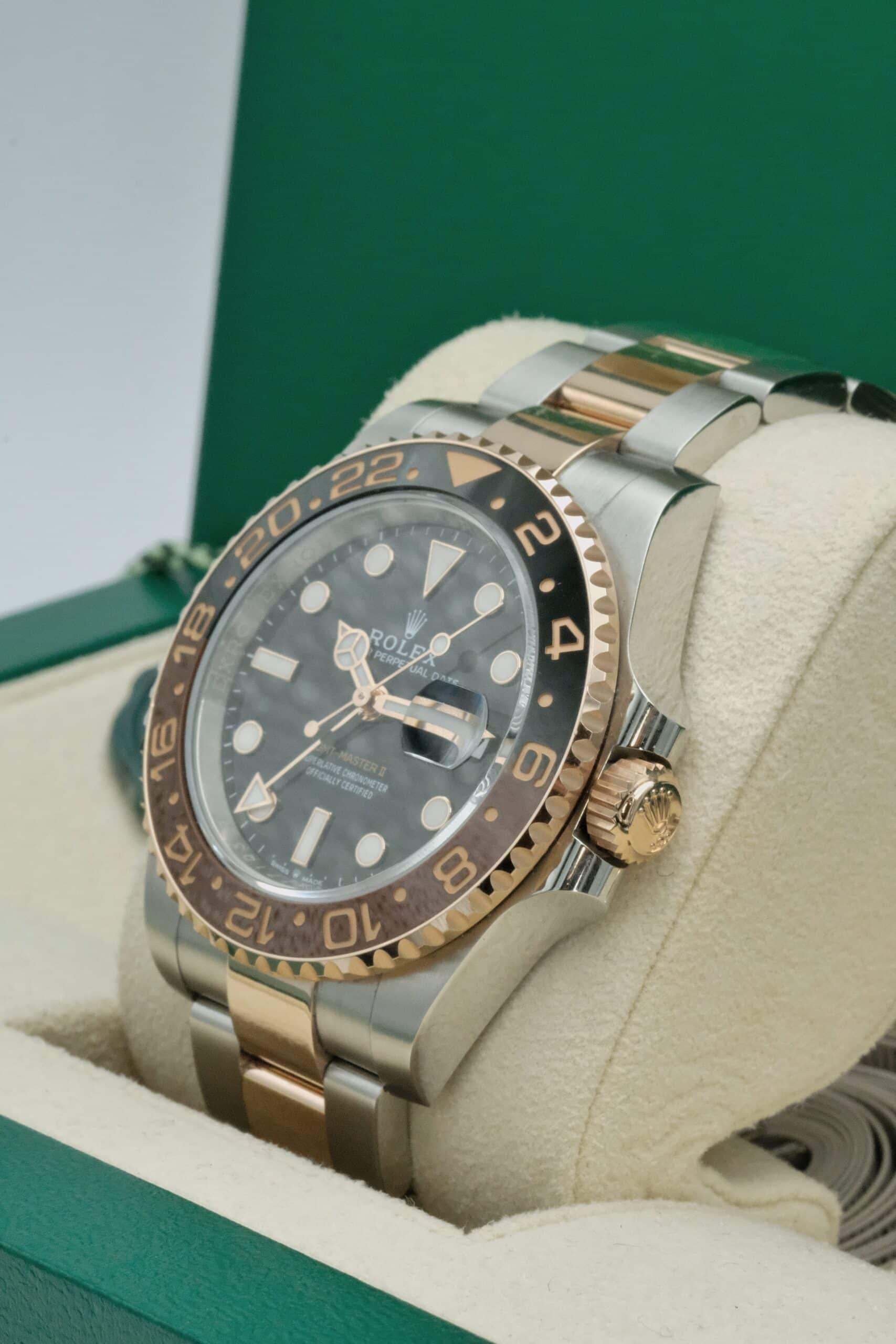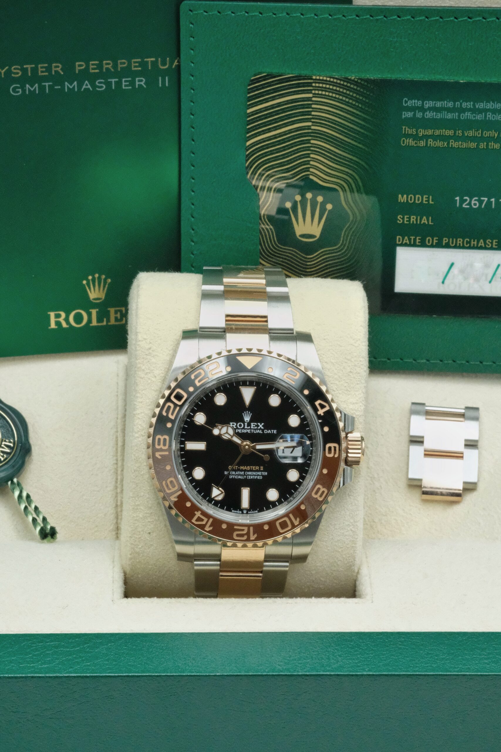 Rolex GMT-Master II 126711CHNR Root Beer, full set 12/2024, condizioni pari al nuovo con pellicole. Cassa e bracciale acciaio/Oro Everose, quadrante nero.
