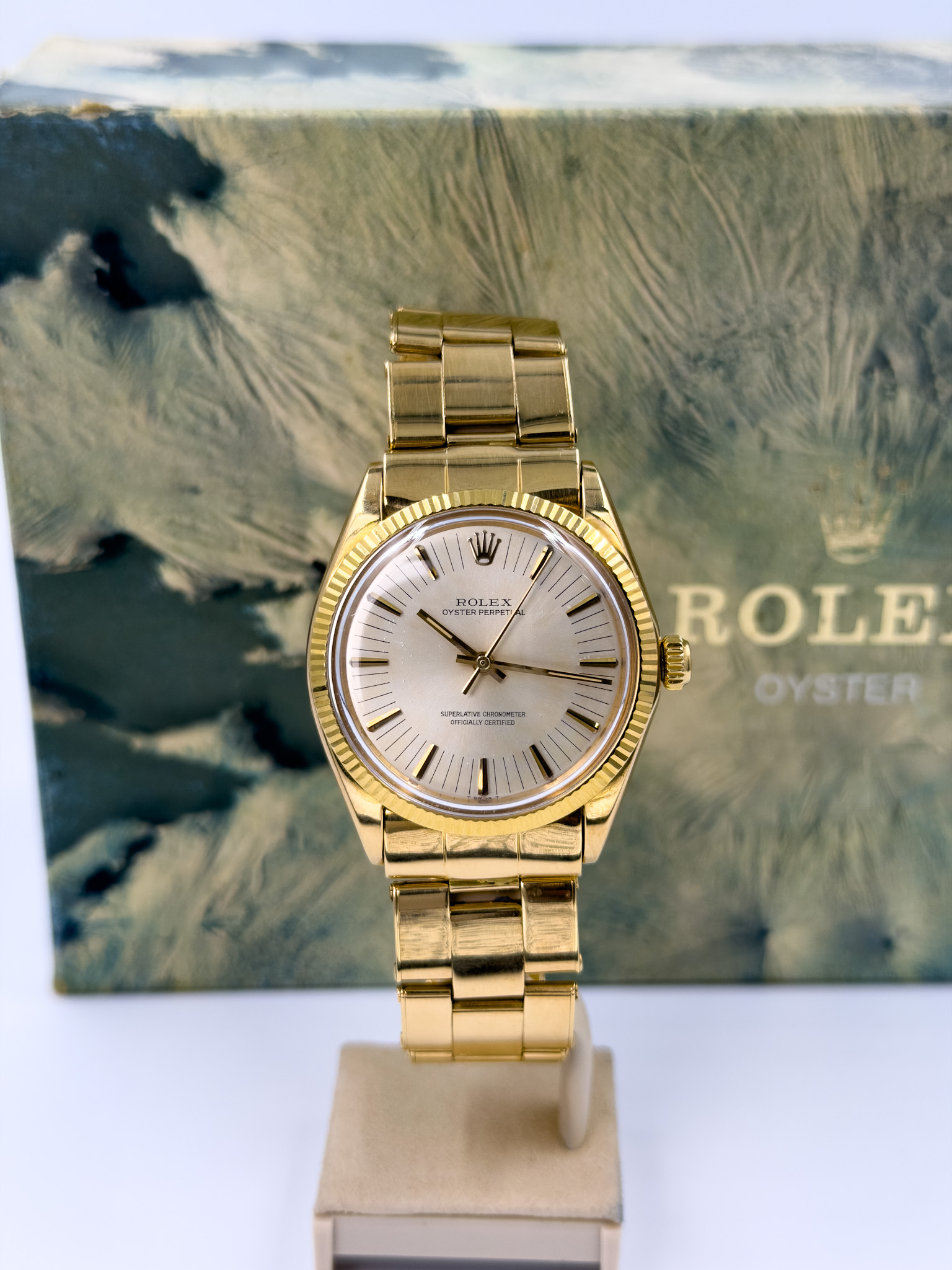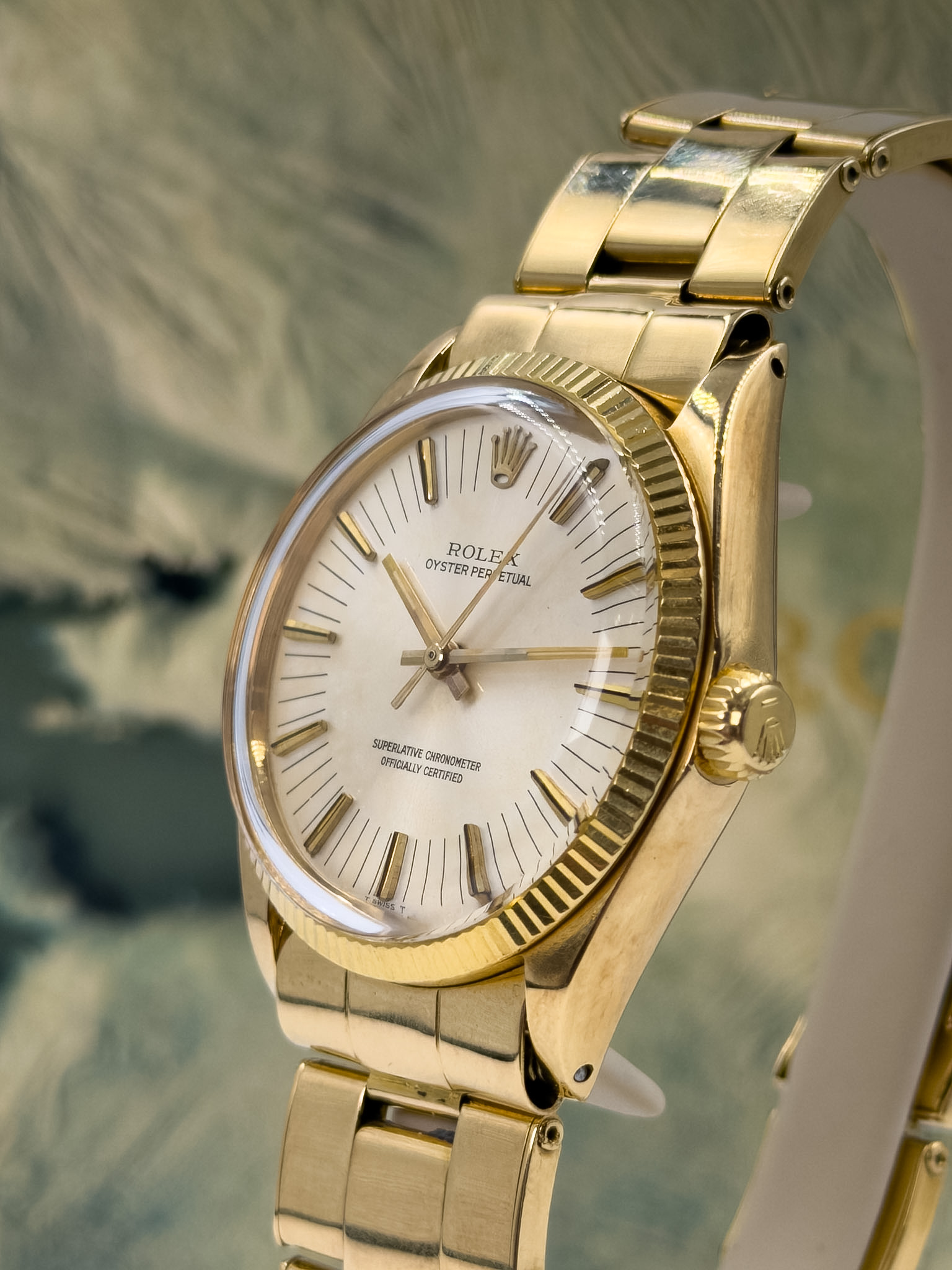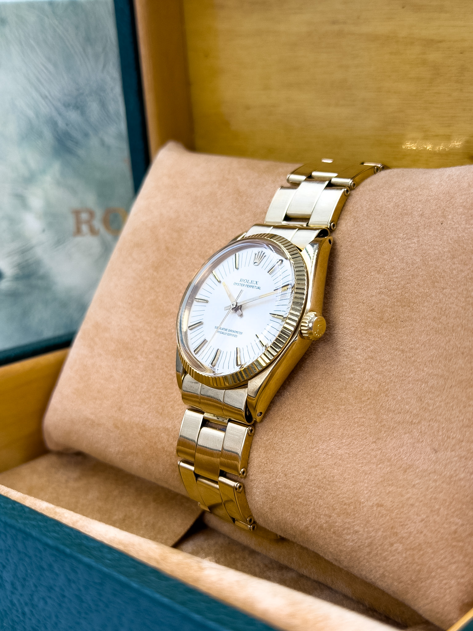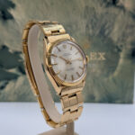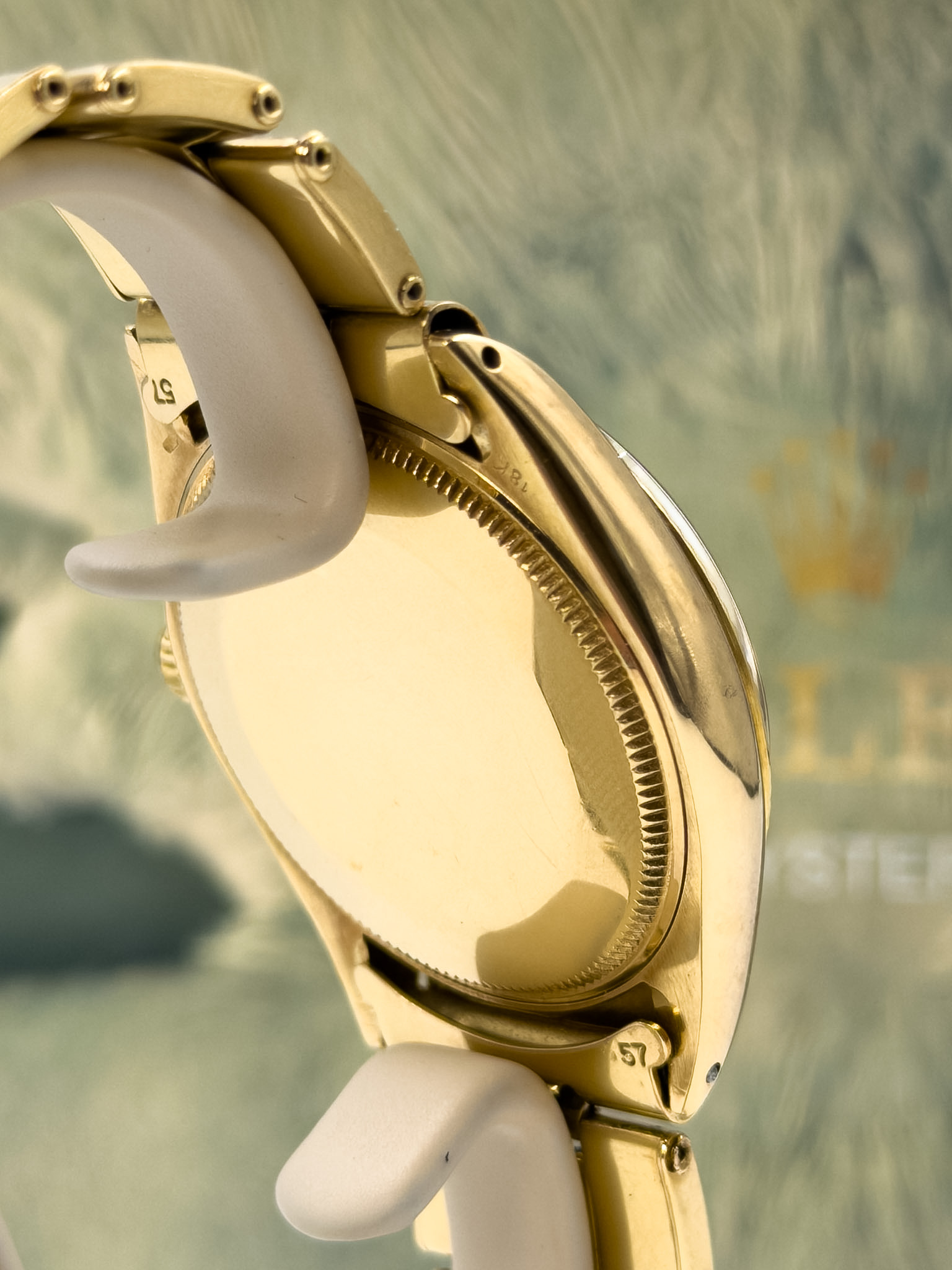 Un raffinato Rolex 1005 in oro giallo 18k con iconico bracciale a maglie ripiegate e quadrante bianco. Un classico dell’orologeria automatica da 34 mm, conservato in ottime condizioni e completo di scatola originale.