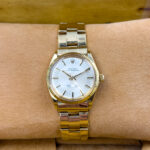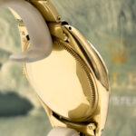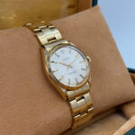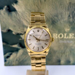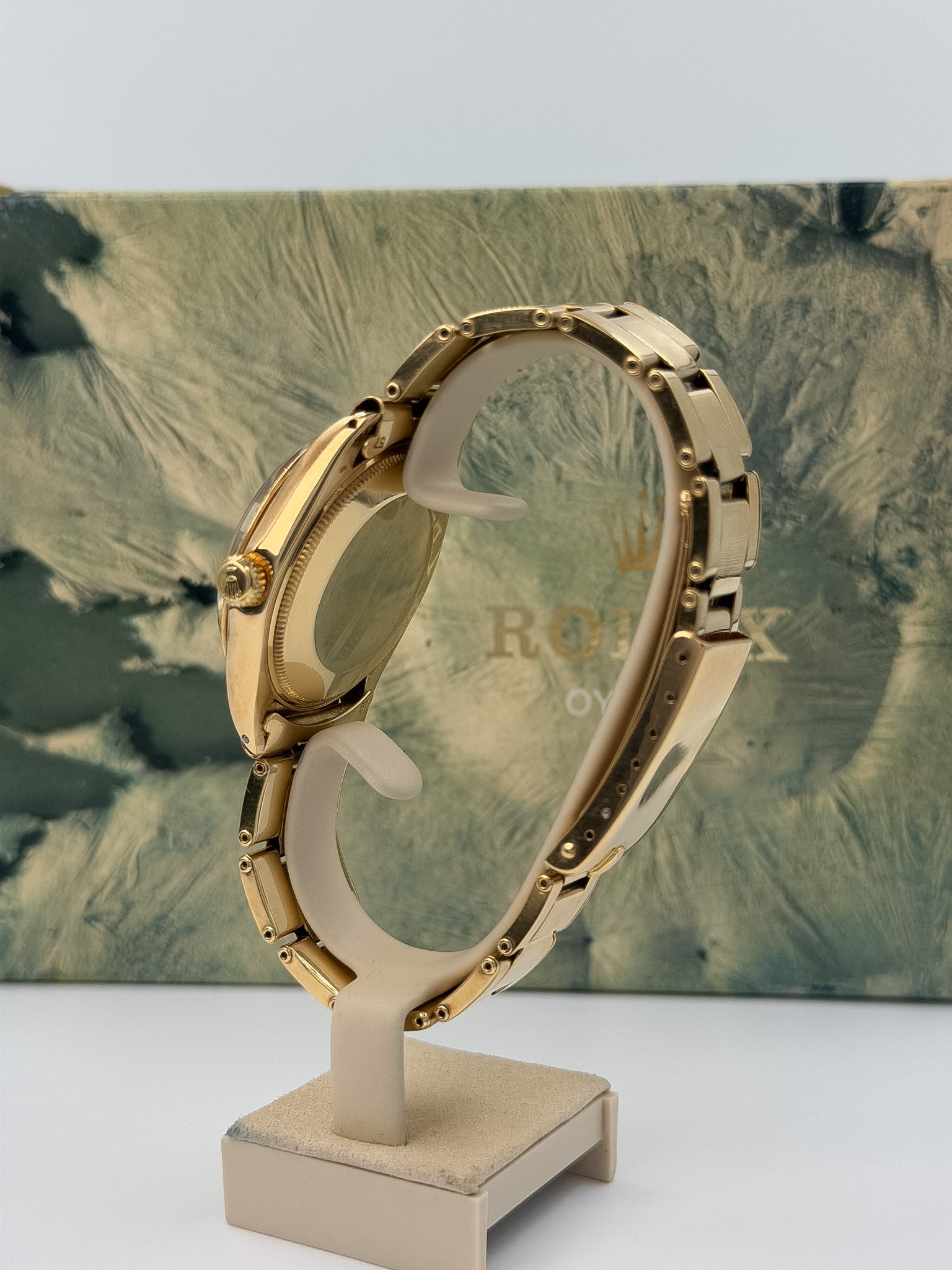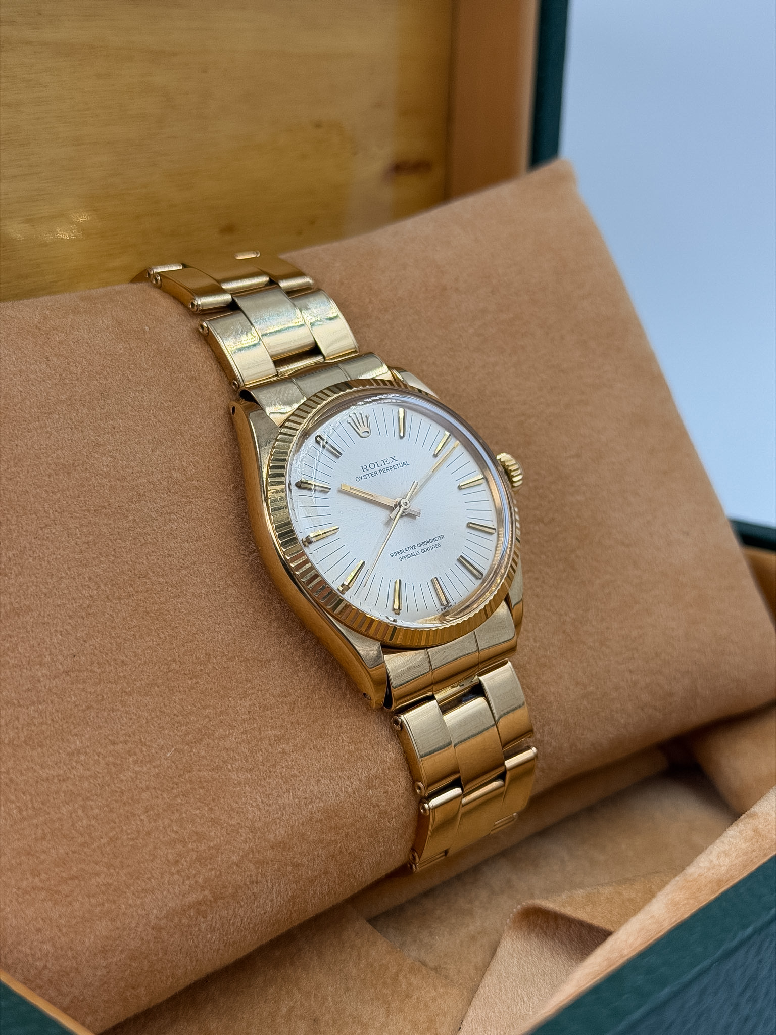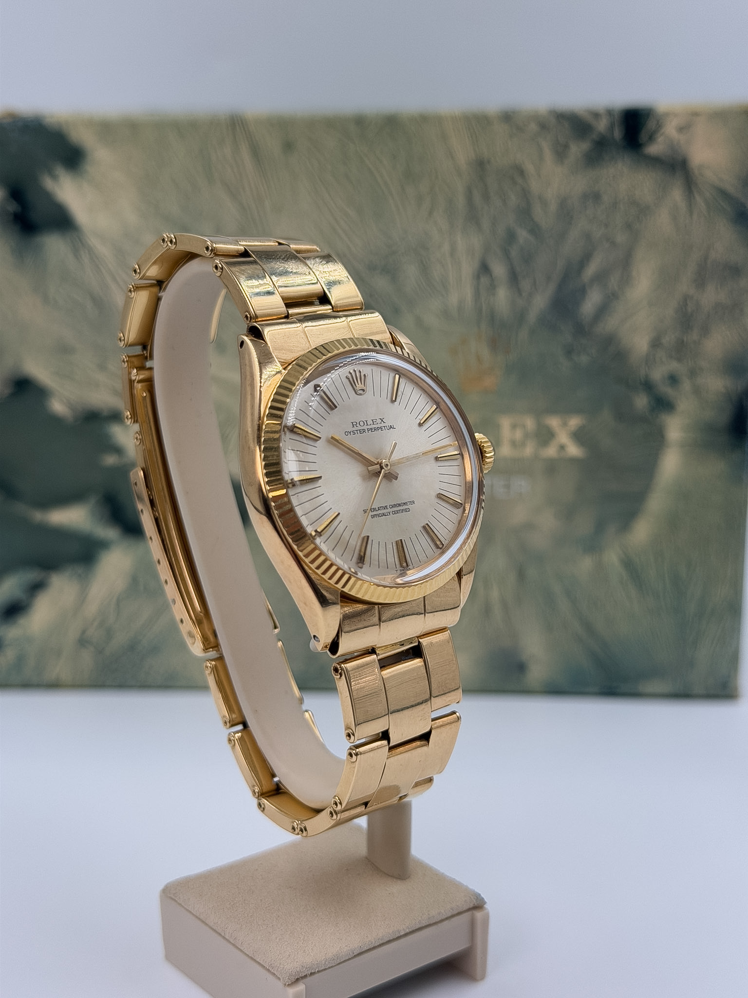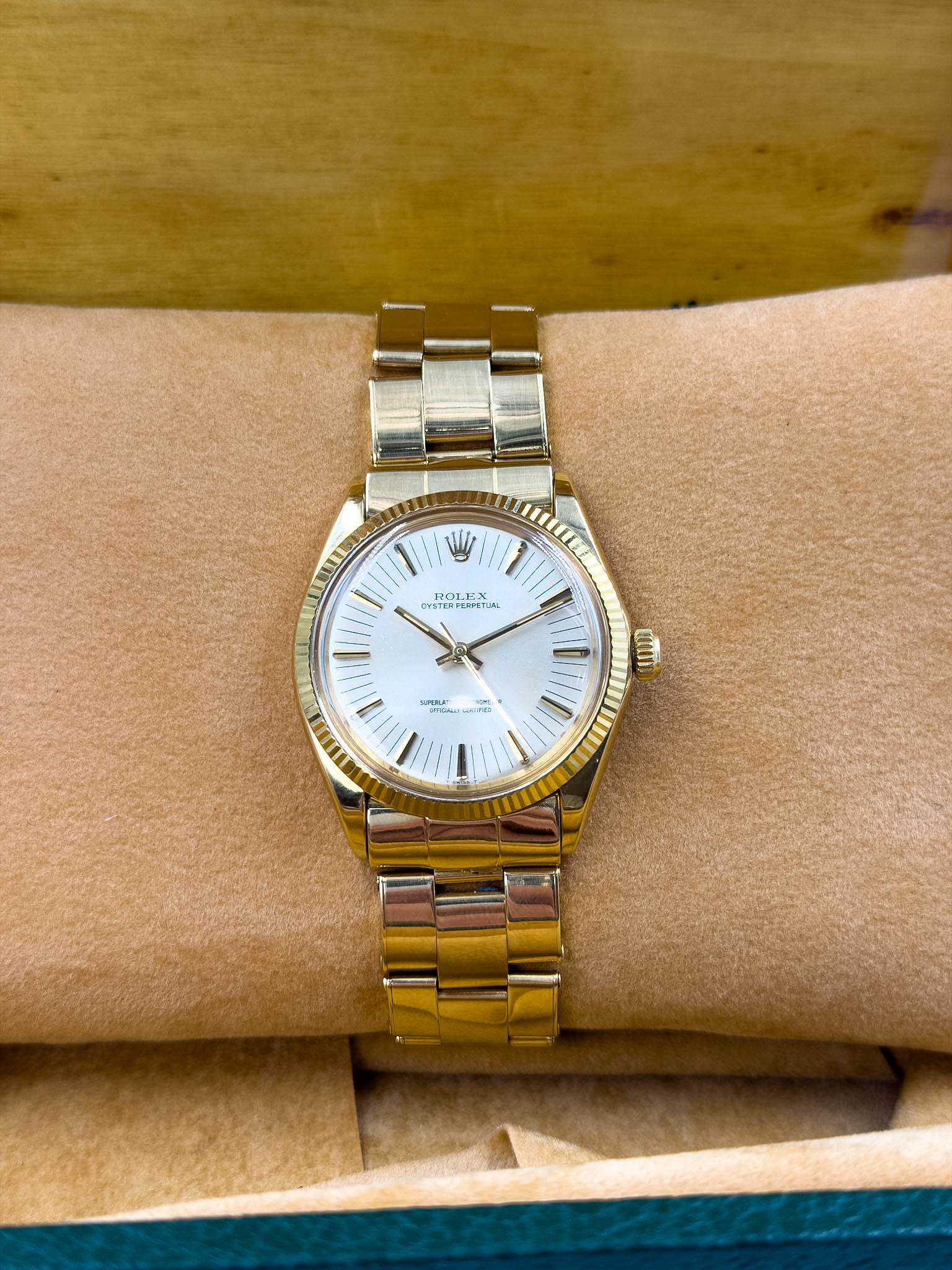 Un raffinato Rolex 1005 in oro giallo 18k con iconico bracciale a maglie ripiegate e quadrante bianco. Un classico dell’orologeria automatica da 34 mm, conservato in ottime condizioni e completo di scatola originale.