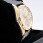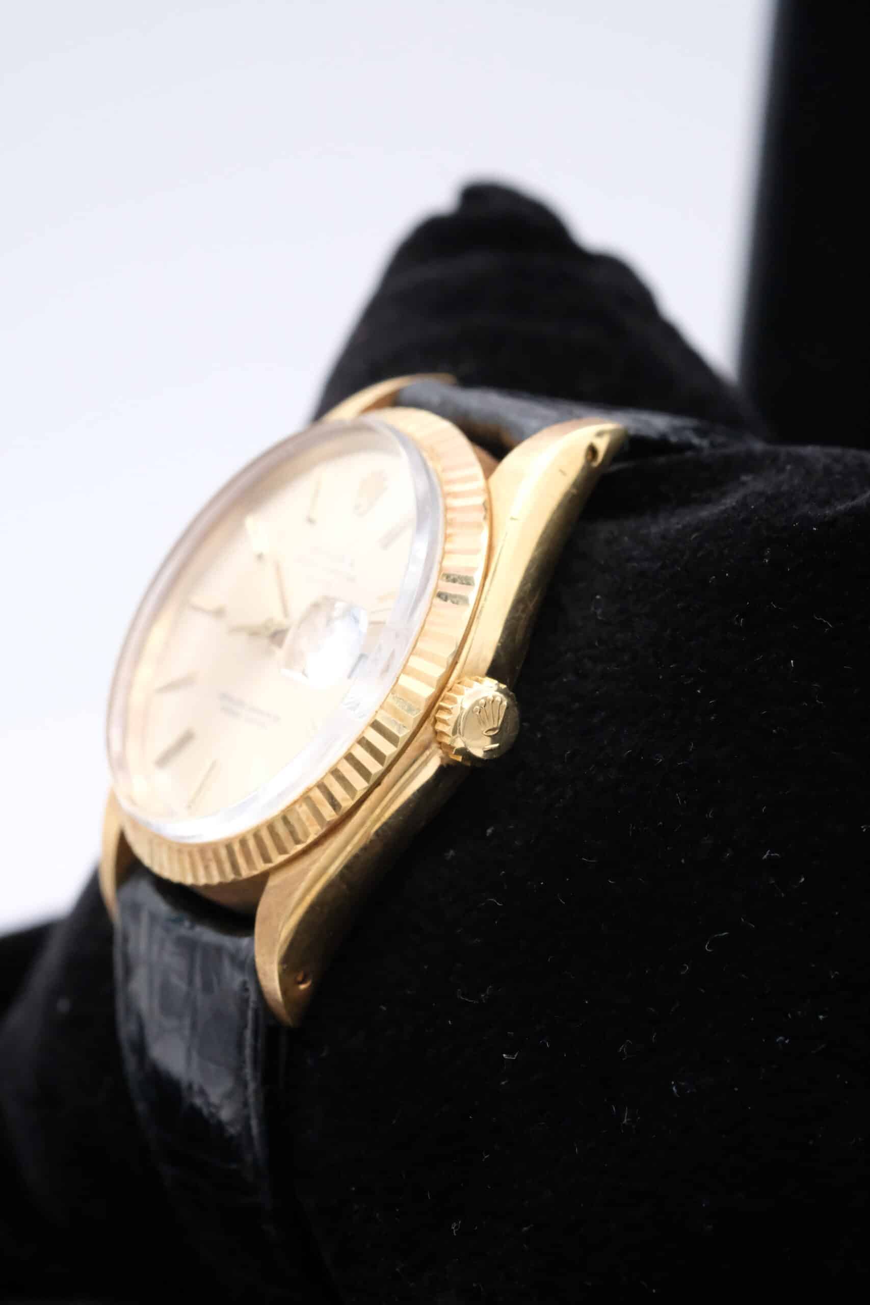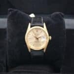 Rolex Oyster Perpetual Date ref. 15038 con quadrante dorato, cassa in oro giallo 34 mm e cinturino in pelle. Buone condizioni, scatola e garanzia 24 mesi del nostro negozio.