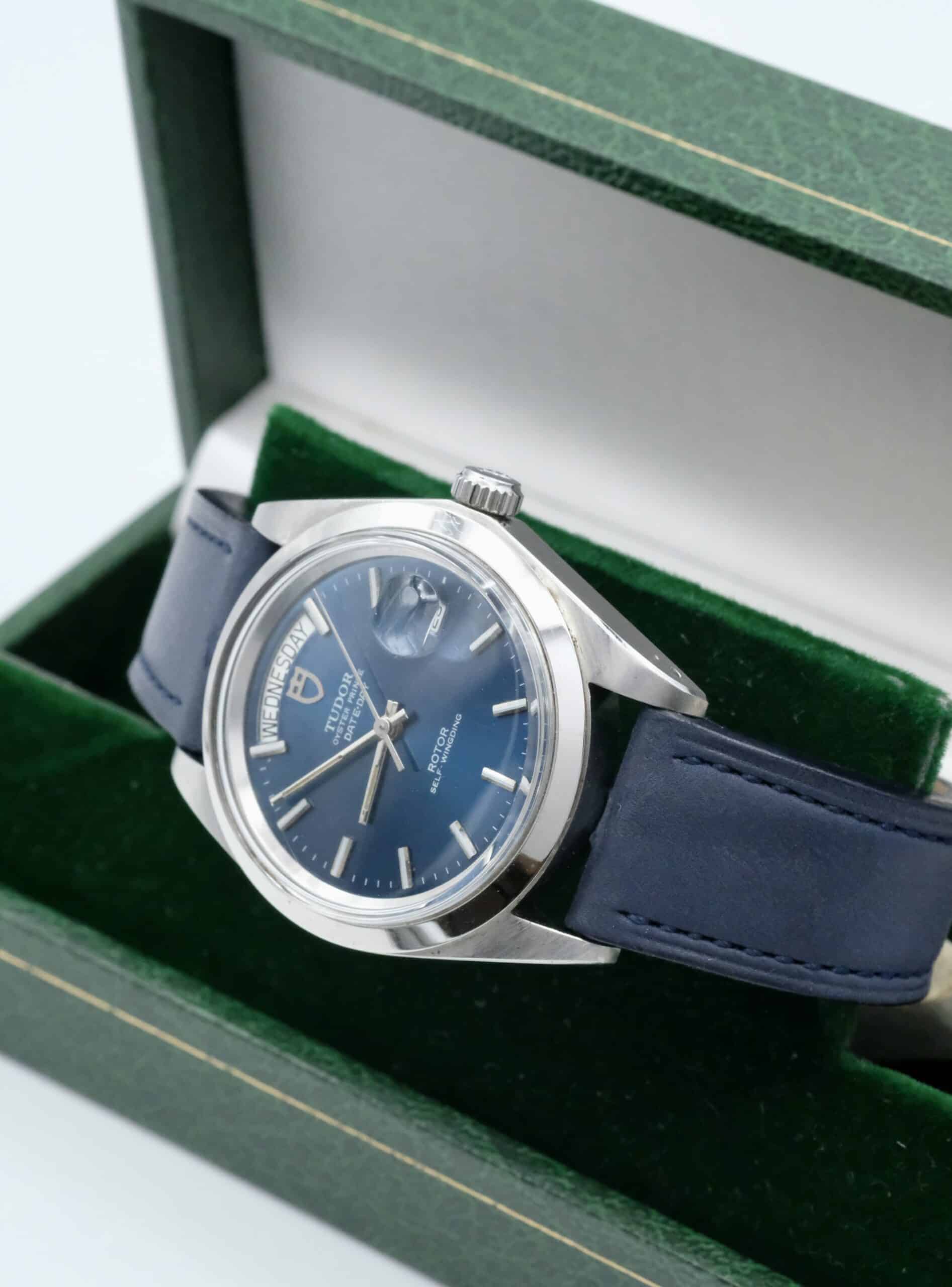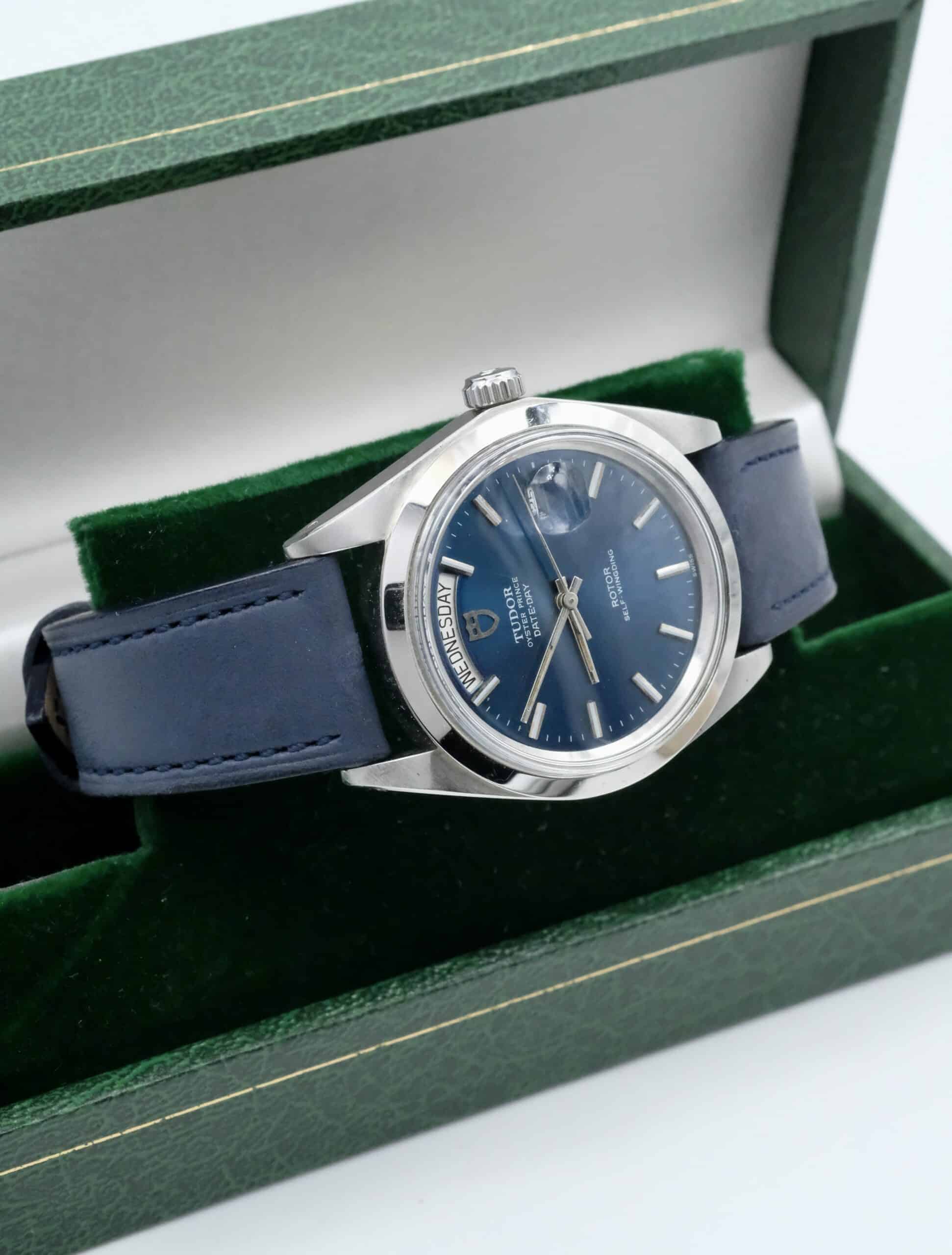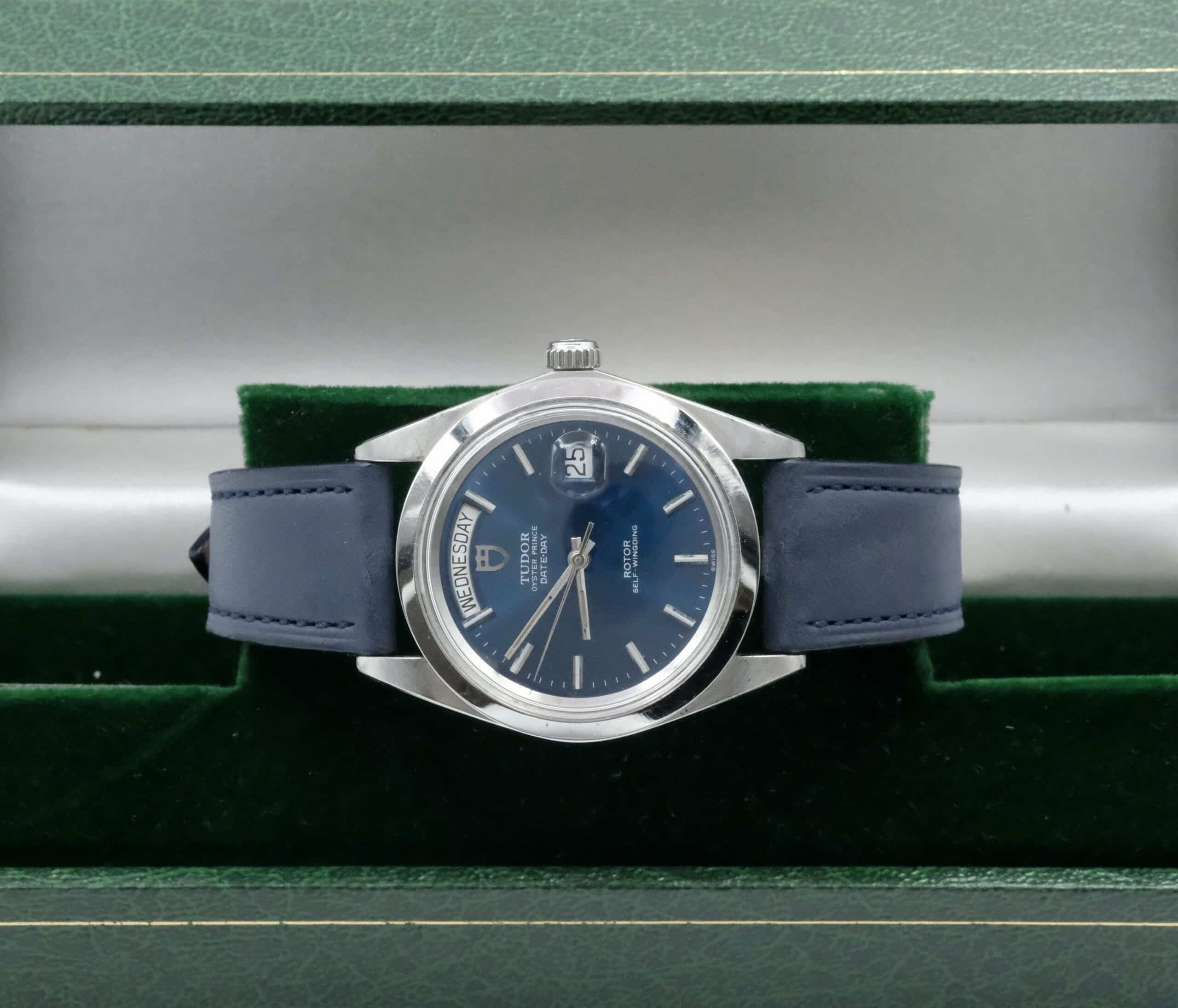 Tudor Prince Date-Day 7019/4, cassa acciaio 36 mm, quadrante e cinturino blu, movimento automatico. Ottime condizioni. Prezzo: 2.600€.