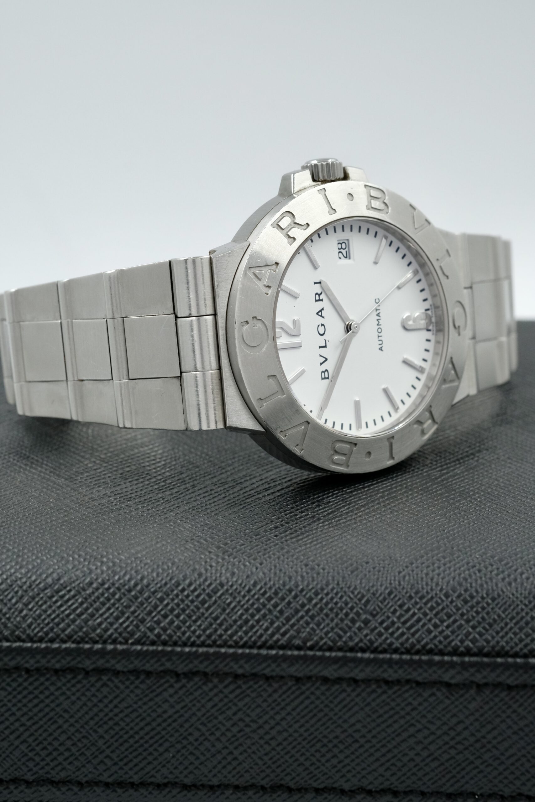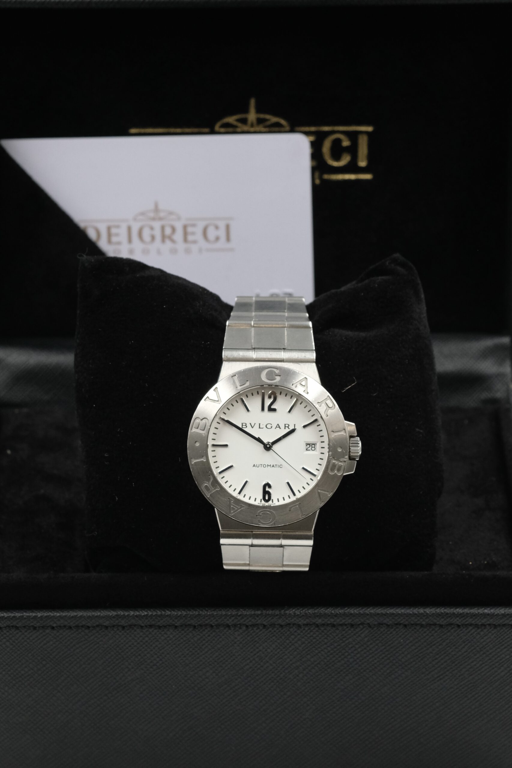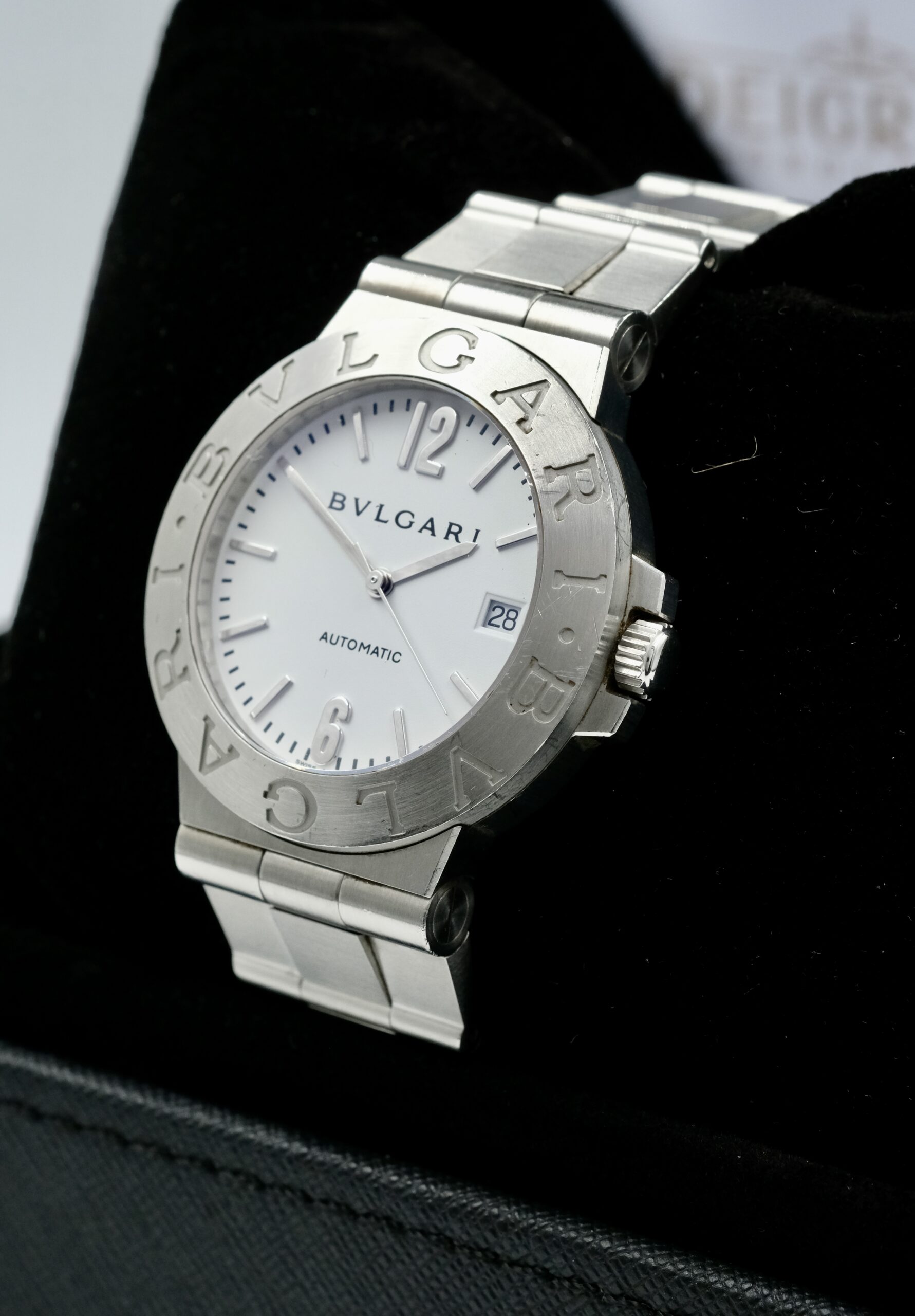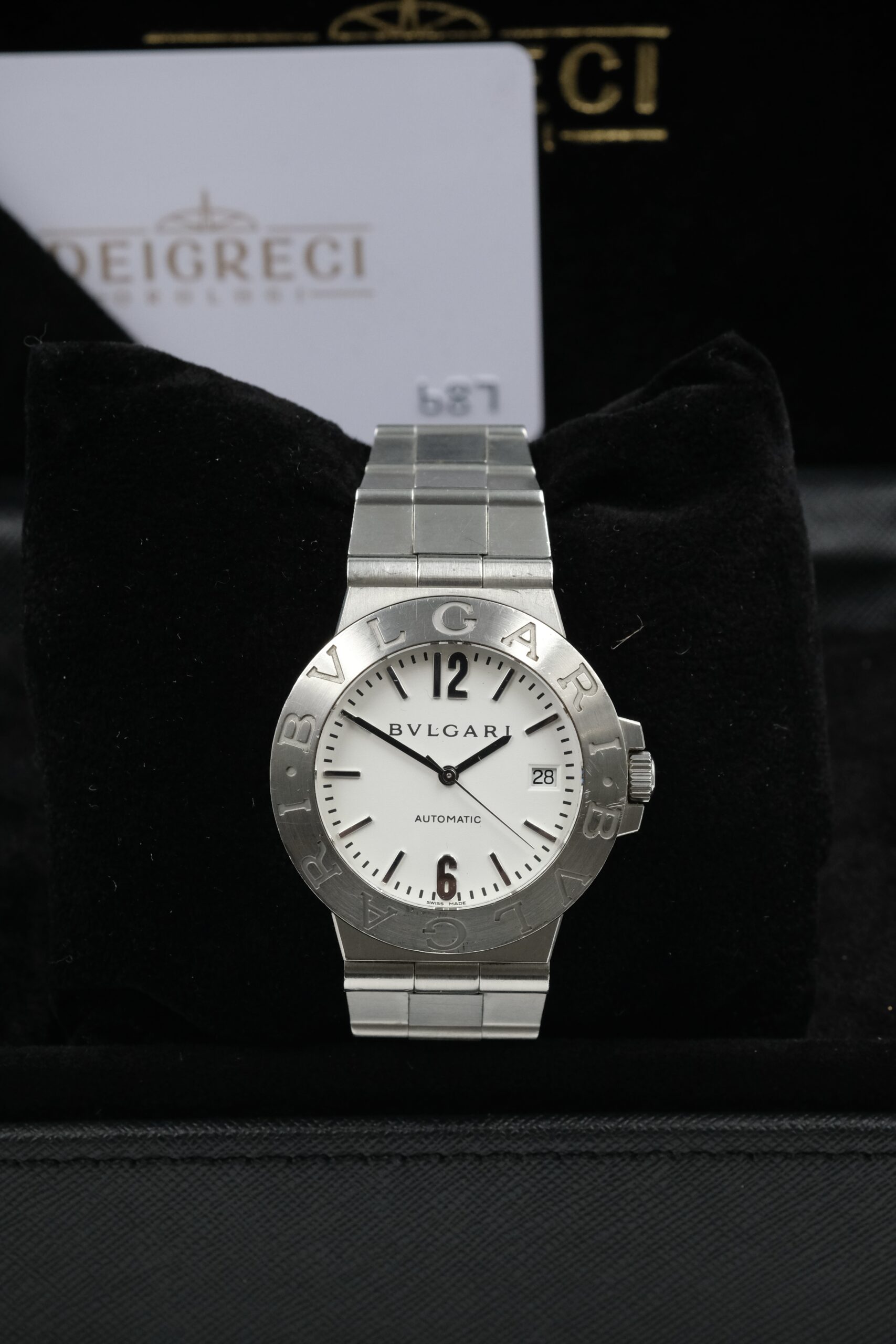 Bulgari Diagono ref. LCV 38 S del 2012, automatico in acciaio con cassa da 38 mm e quadrante bianco a numeri arabi. Design sport-elegante, funzione data e vetro zaffiro. In ottime condizioni.