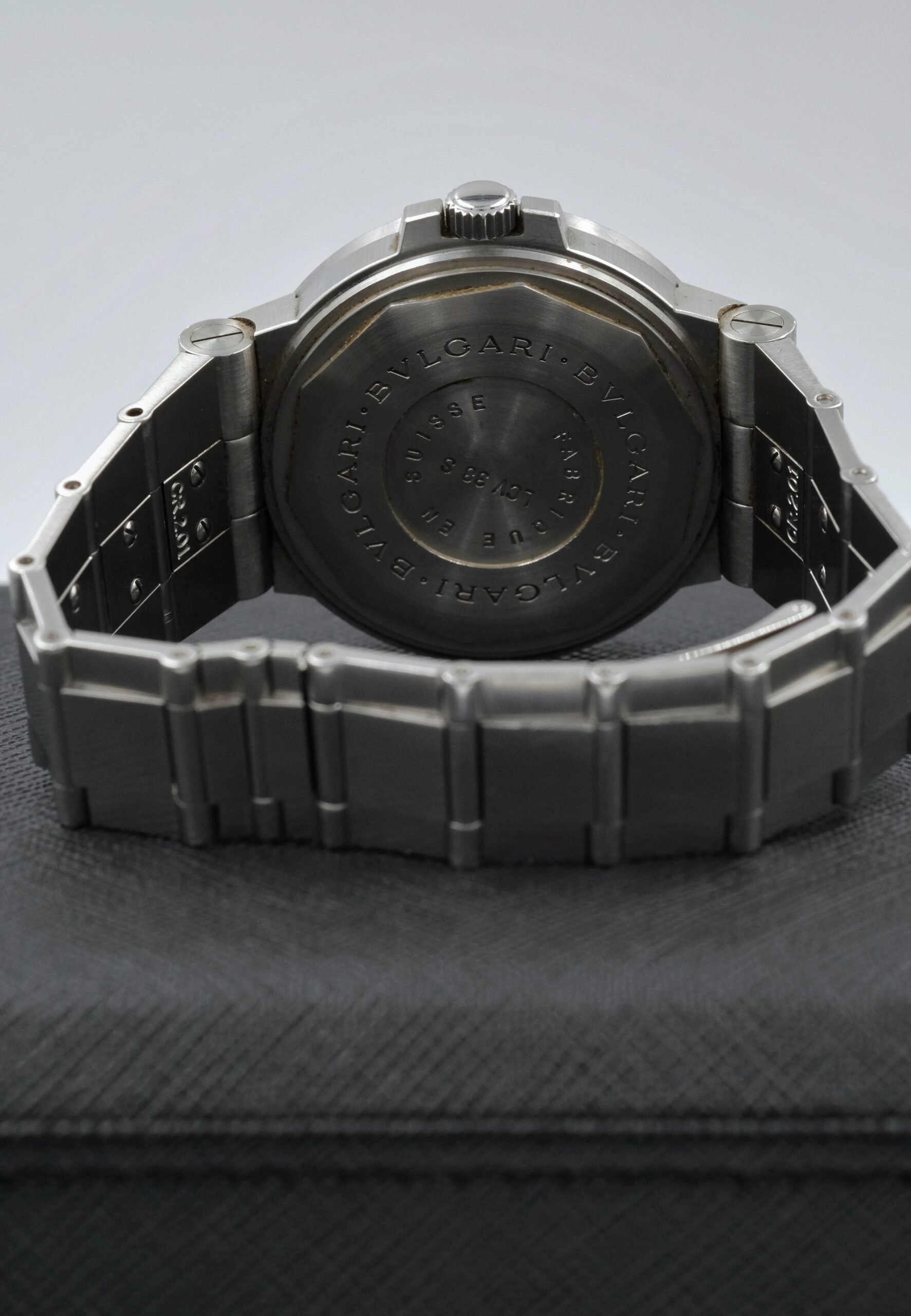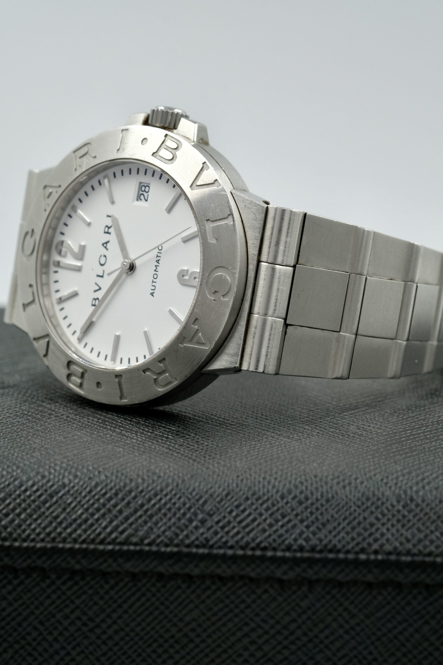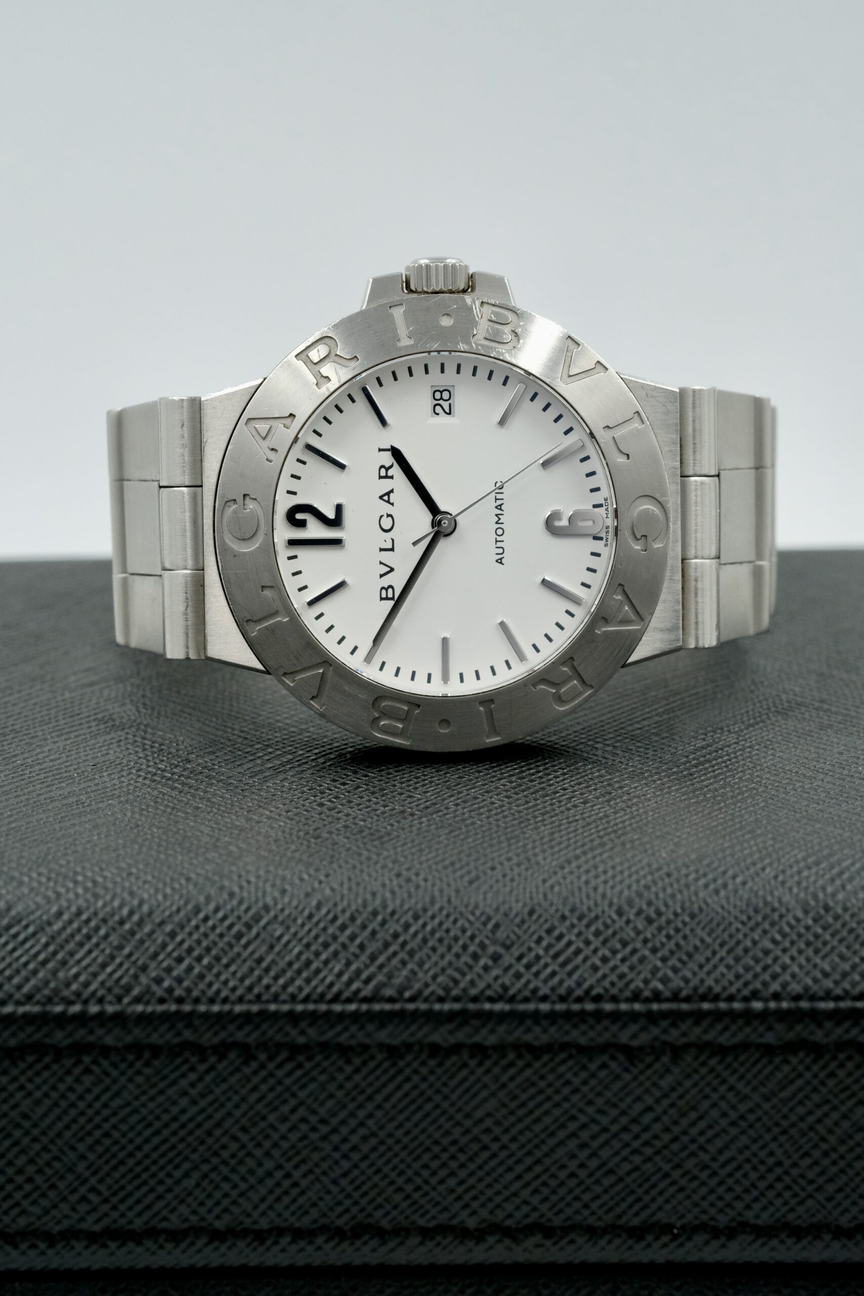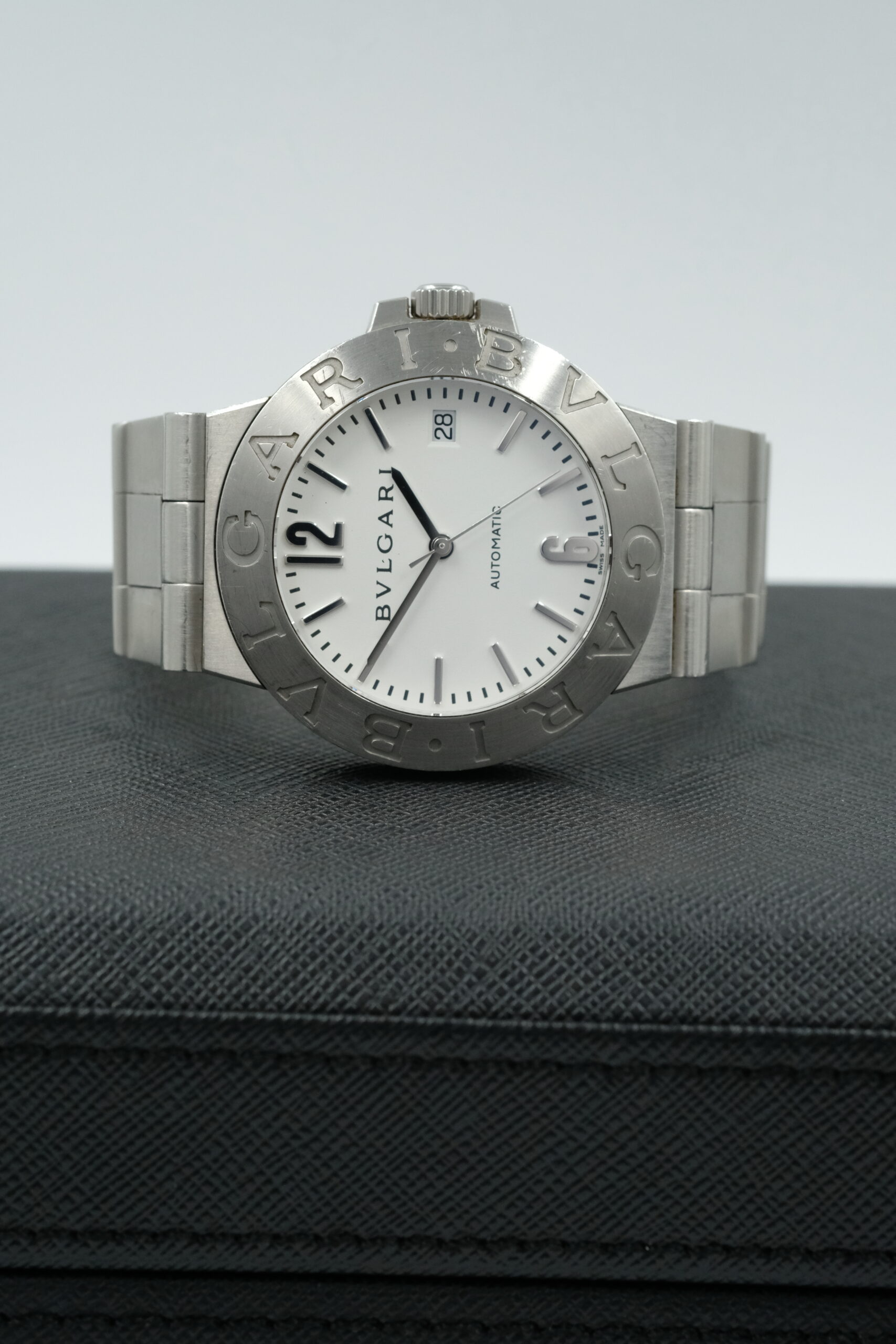 Bulgari Diagono ref. LCV 38 S del 2012, automatico in acciaio con cassa da 38 mm e quadrante bianco a numeri arabi. Design sport-elegante, funzione data e vetro zaffiro. In ottime condizioni.